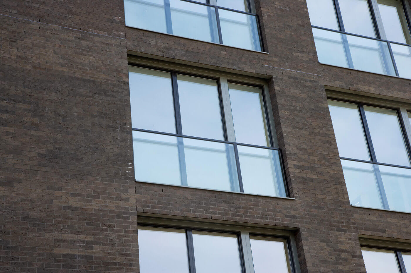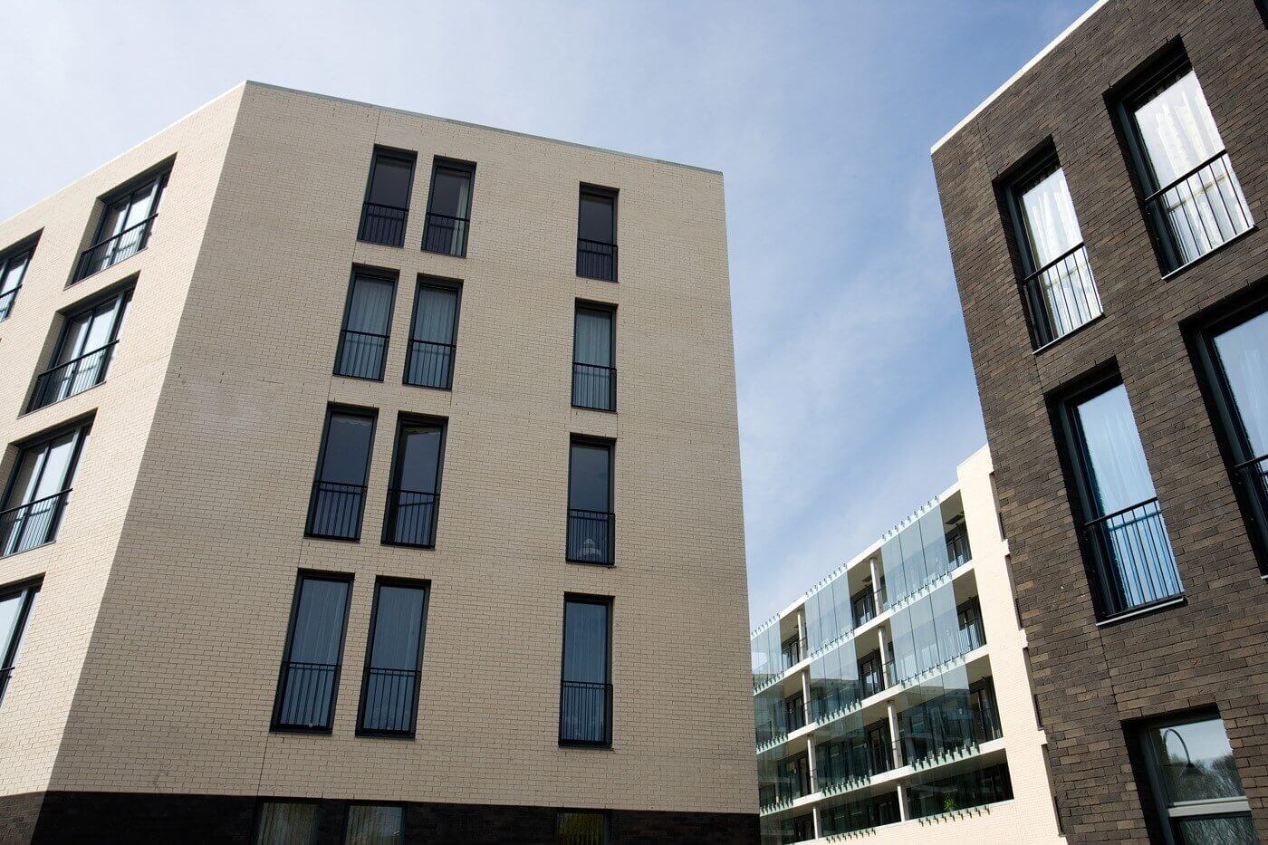 In het ontwerp ontstond ruimte voor een aantal binnengebieden die allemaal hun eigen sfeer hebben. Zo is er een groen pleintje met zicht op de omringende natuur en een plek waar je het aangrenzende water van de Lage Wetering kunt zien. Op verschillende plaatsen is er uitzicht op de bebouwing van het oude dorp Zoetermeer. En er is een levendig, bijna ‘stedelijk’ plein waar veel voorzieningen zijn samengebracht, zoals een gezondheidscentrum met huisartsenpraktijk, apotheekvoorziening, fysio- en oefentherapiepraktijk, maatschappelijk werk en kinderopvang. De vier gebouwen die dit plein vrijwel omsluiten, zijn via galerijen met elkaar verbonden. Verrelst: ‘De opdrachtgever voorzag een aantal categorieën woningen al naar gelang de zorgbehoeften. De galerijen maken het mogelijk dat zorgverleners kunnen werken vanuit een centraal punt en snel van gebouw naar gebouw kunnen.’ maar met dunbedmortel in dezelfde kleur gemetseld. Daardoor komen de kleuren extra mooi uit, zeker als de zon er op staat. Verbindende factoren zijn ook de opvallende betonnen portiek van elk gebouw en zeker de verdiepingshoge ramen. Wij stellen ze vaak voor en komen dan eigenlijk als vanzelf uit bij Metaglas. In houten kozijnen met houten draaiende delen zijn zulke hoge ramen nauwelijks mogelijk en zie je vooral veel hout. De aluminium omkadering die we hier hebben gekozen, zorgt voor maximale transparantie. Precies wat we willen.’