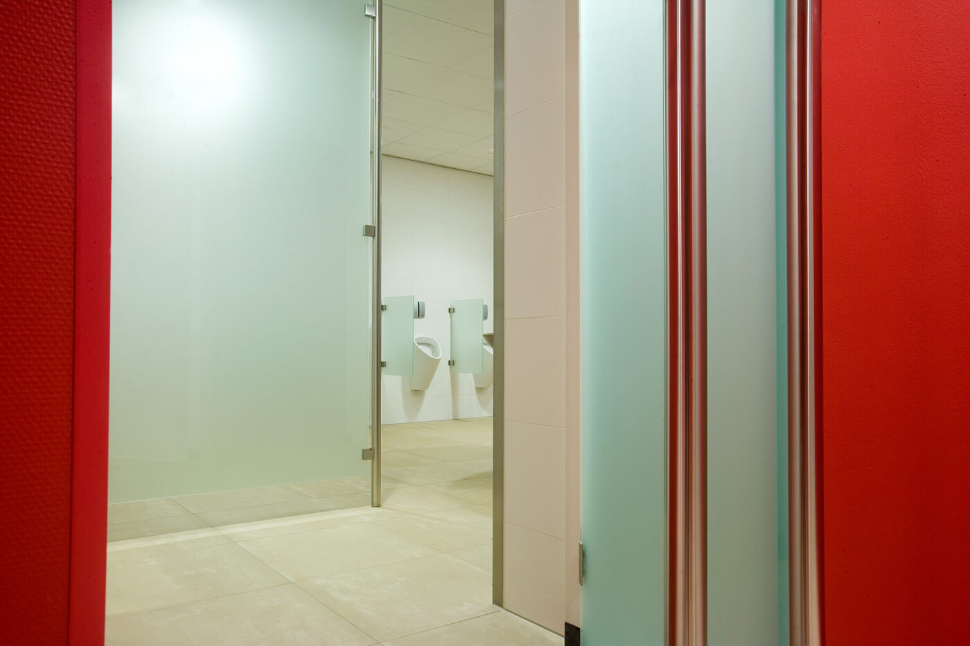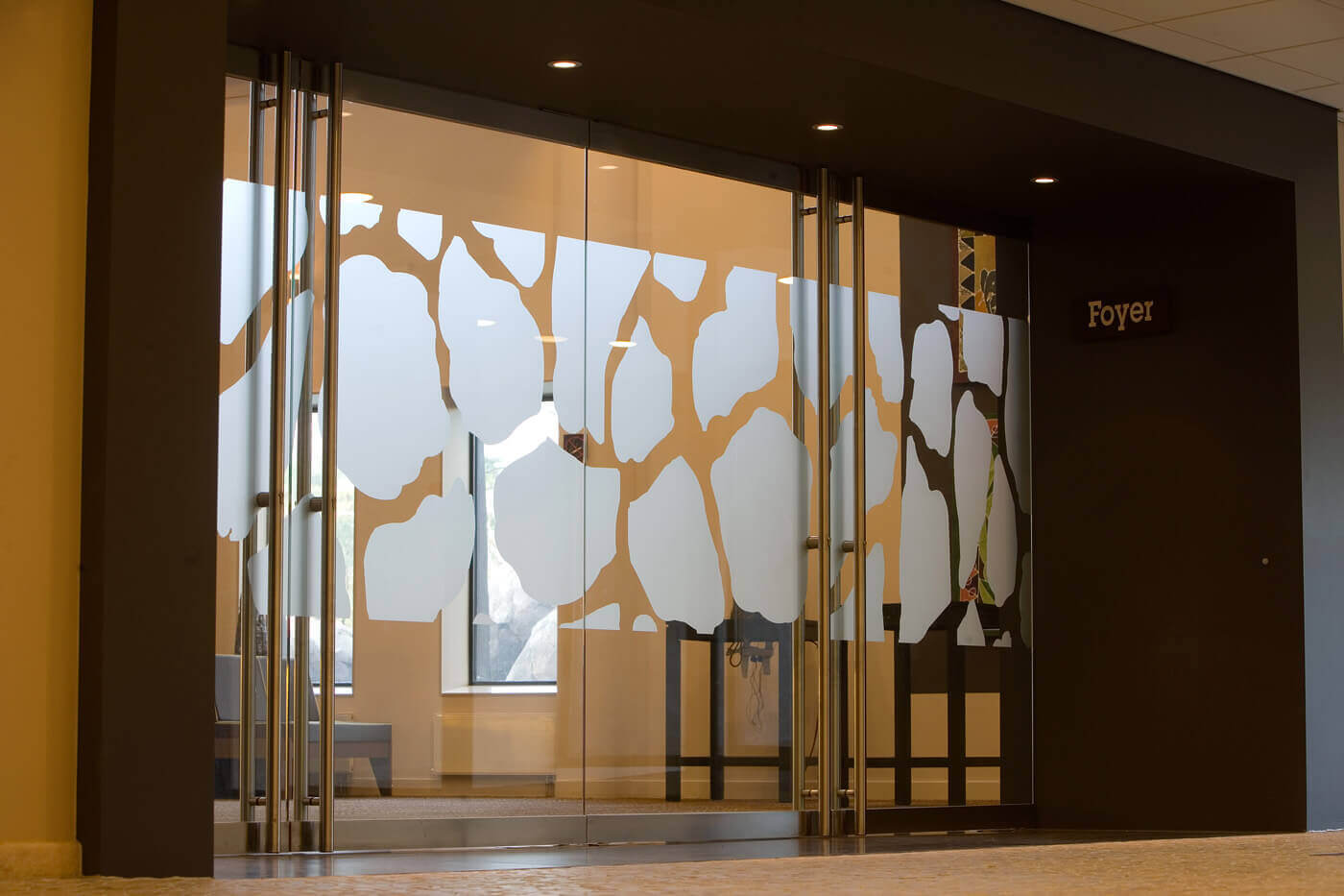 Om alle ruimten een open karakter te geven, is gekozen voor Total Glas deuren zonder omlijsting. De deuren, voorzien van een opvallende gezandstraalde giraffeprint en Metinox rvs beslag, vormen een fraaie entree naar de foyer. Ook in de stijlvolle toiletgroepen is gekozen voor veel glas.
