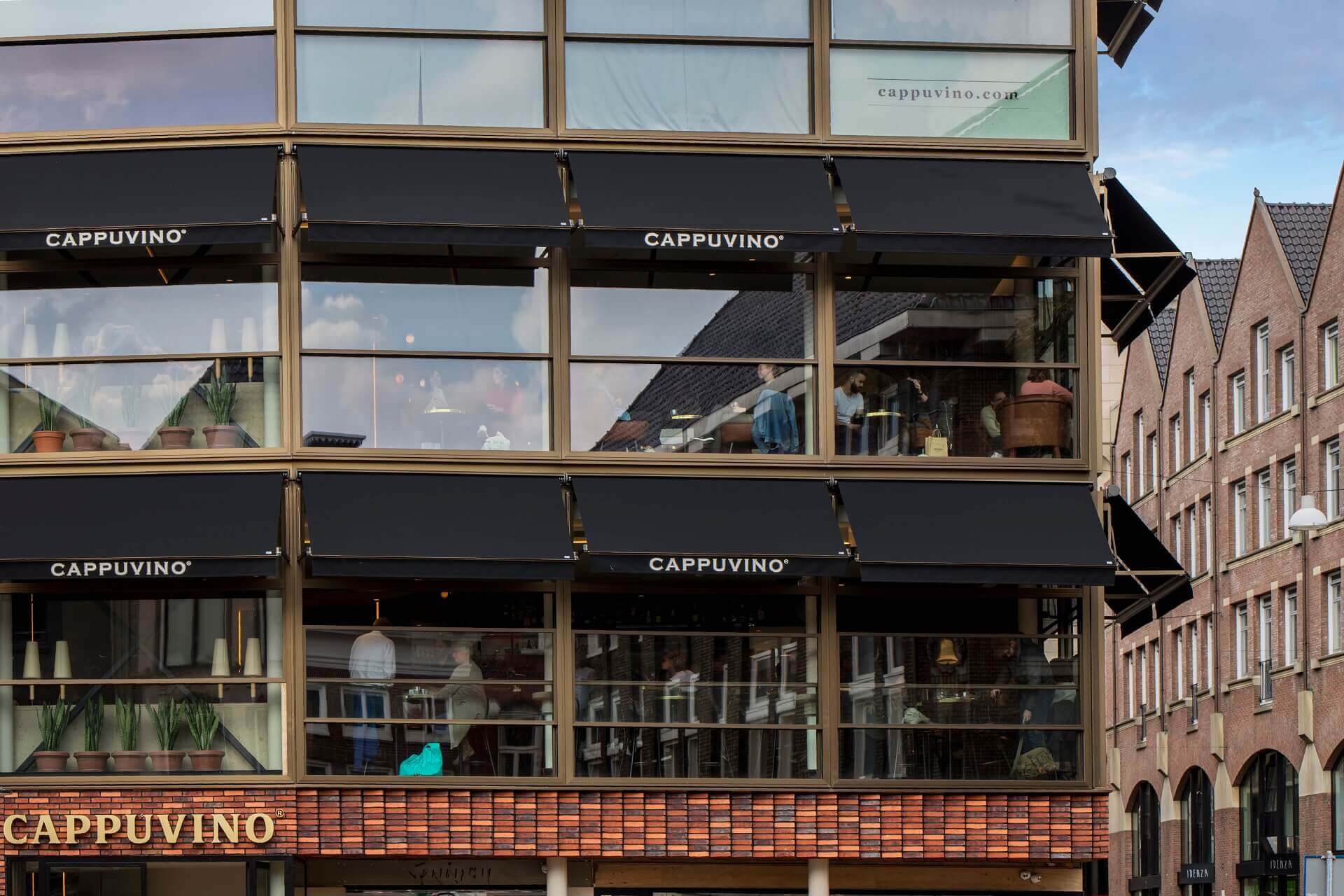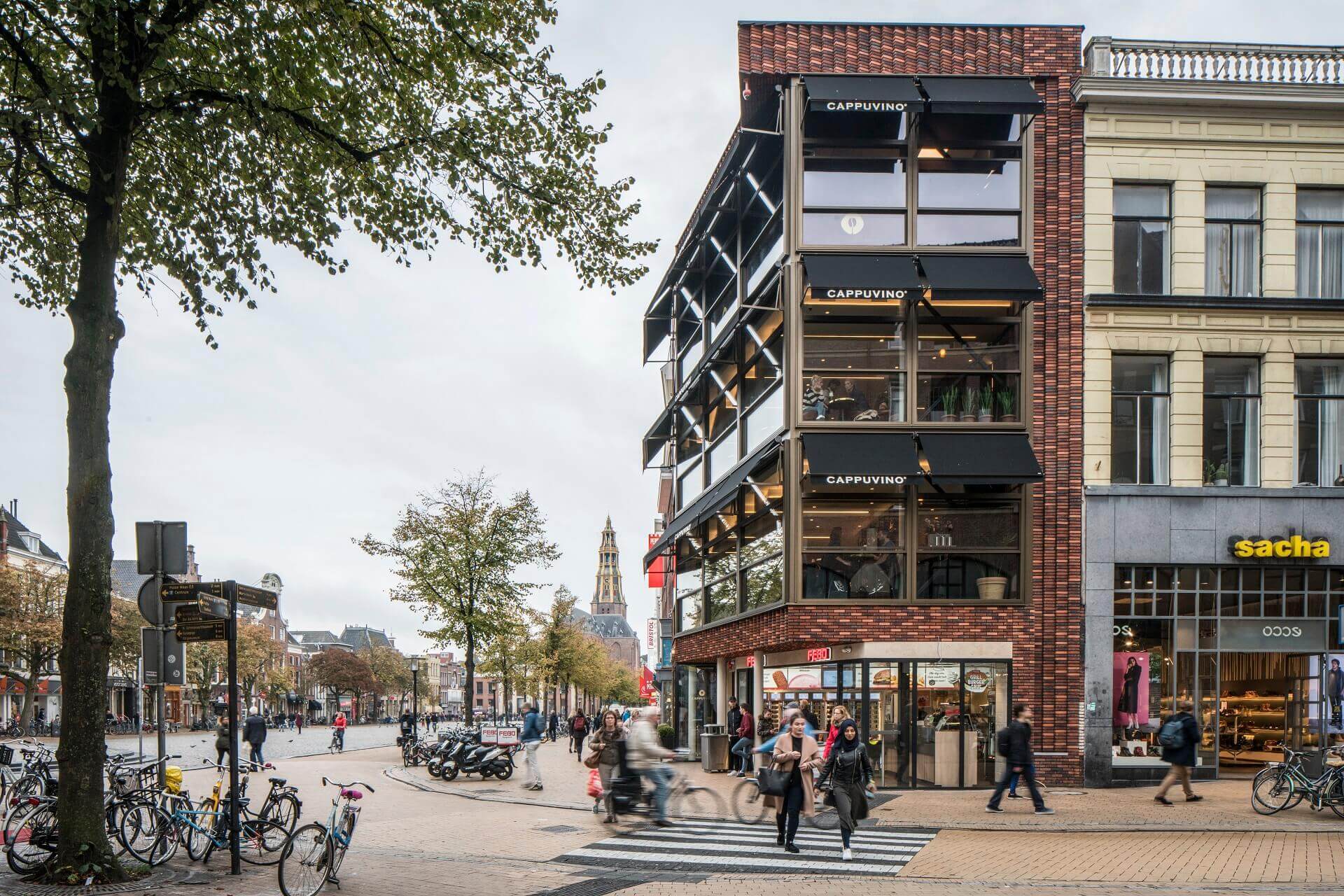 ‘Rond vijf uur ’s middags switchen we van koffiebar naar wijnbar, dat zorgt voor een mooi schouwspel.’ Dit schouwspel is ook buiten op de levendige Vismarkt goed zichtbaar dankzij de uitdnodigende, grotendeels glazen voorgevel van Cappuvino. Dreize: ‘Zo willen we mensen verleiden bij ons binnen te komen. Eenmaal binnen ontvouwt zich een panorama op de markt. Bij mooi weer zetten we de elektrische schuiframen open en waan je je op een terras aan de markt. Zo geniet je binnen van buiten.’