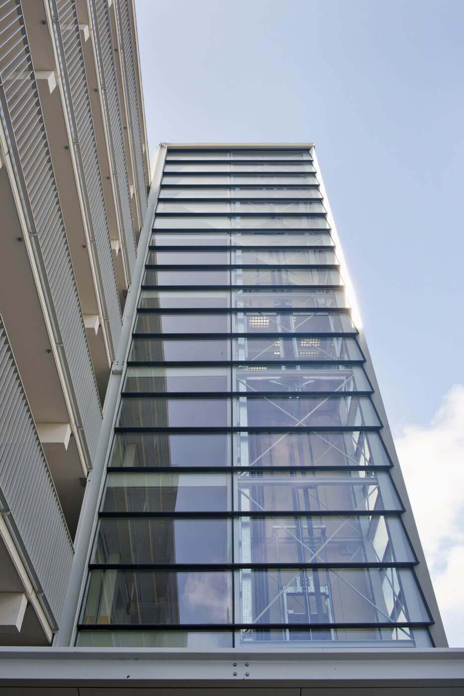 Architectonische blikvangers zijn twee nieuwe transparante torens bij de entrees. Deze torens doorbreken de horizontale galerijen met een opvallend verticaal element, waardoor het aanzicht van de flats veel minder massief wordt. Ze zijn vrijwel helemaal opgebouwd uit iets naar achteren gekantelde glazen lamellen. De beglazing in de toren van de Castor-flat, aan de zonzijde, is voorzien van een oranje zeefdruk in streeppatroon die zorgt voor zonwering.