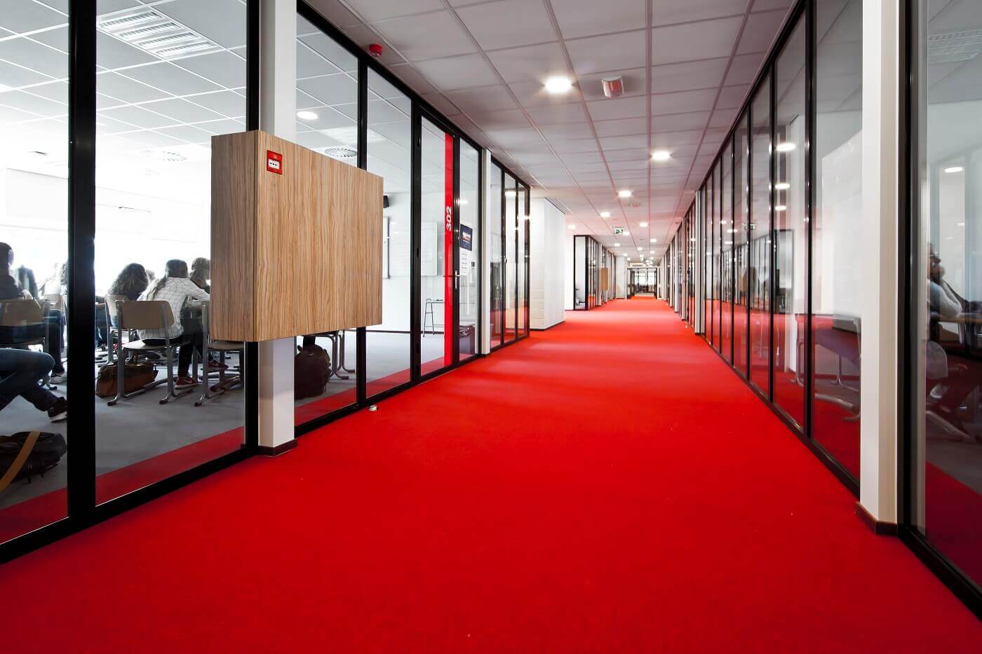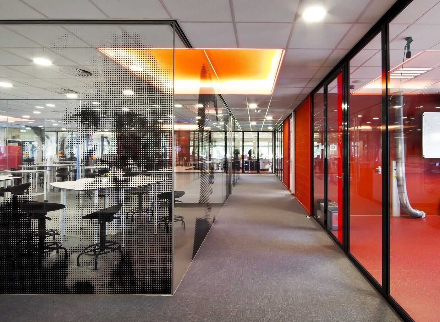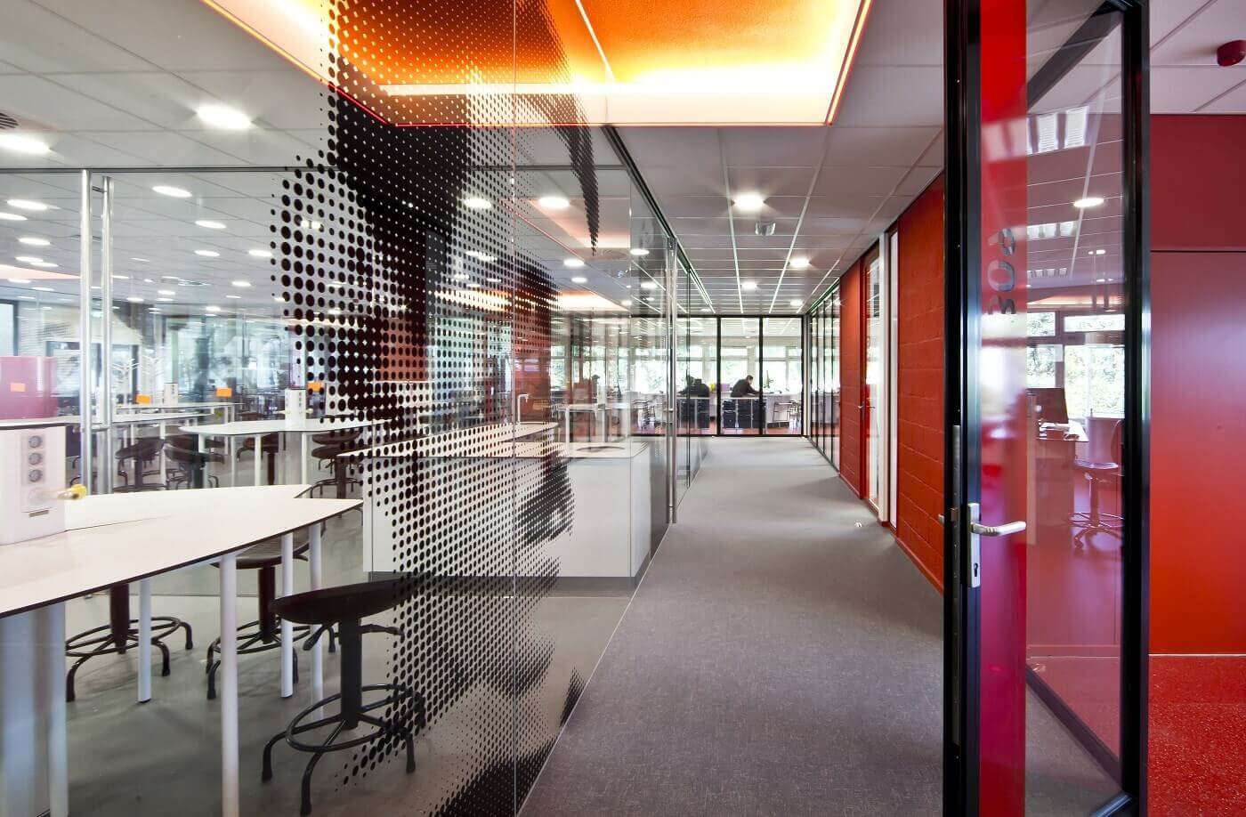 Het BiNaS gebied is de omgeving waar de vakken Biologie, Natuurkunde en Scheikunde gegeven worden. De instructie- en practicumlokalen waren georganiseerd rondom een centraal gelegen collegezaal. Zowel de collegezaal als de lokalen hadden geen relatie onderling; vanaf de gang was niet te zien wat er zich in de lokalen afspeelde. Denkkamer architectuur & onderzoek stelde voor om de spannende en integrerende onderzoeken die plaatsvinden in de lokalen zichtbaar te maken. Het binnengebied is omgetoverd tot het kloppende hart van de vleugel. Hier is het centrale lab ingericht en voorzien van volglazen Total Glas wanden – en schuifdeuren met minimalistisch Metinoxbeslag. De aluminiumprofielen van het systeem zijn volledig weggewerkt in de vloer, waardoor het systeem geheel drempelloos is en een grote glasoppervlakken zijn gecreëerd. Door de lokalen te voorzien van veel glas is er een licht en ruimtelijk laboratoriumomgeving ontstaan.