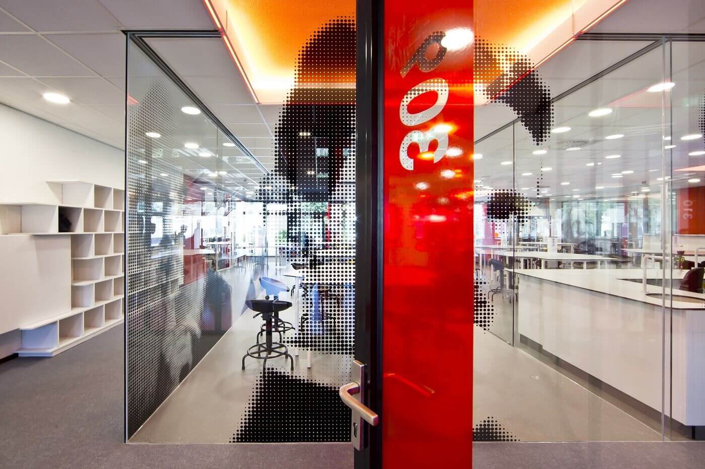 Om samenhang in het gebouw te creëren met een eigen identiteit voor de onderwijsgebieden, heeft Denkkamer architectuur & onderzoek is samenspraak met de docenten van het Commanderij College hun historische schei- en natuurkundige idolen gezandstraald op de glazen wanden. Dit geeft de ruimte een bijzondere eyecatcher.