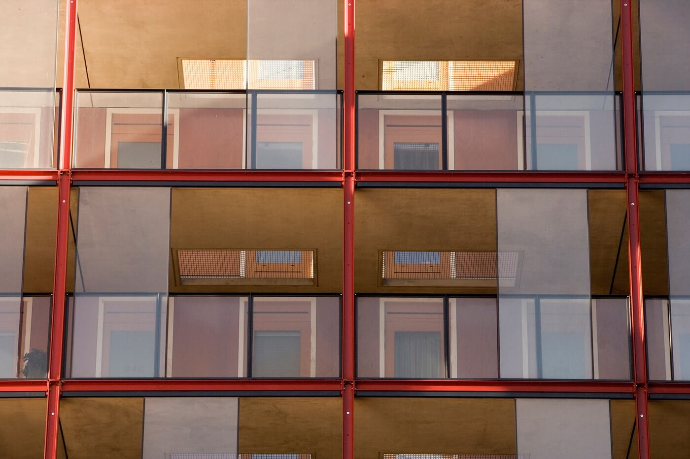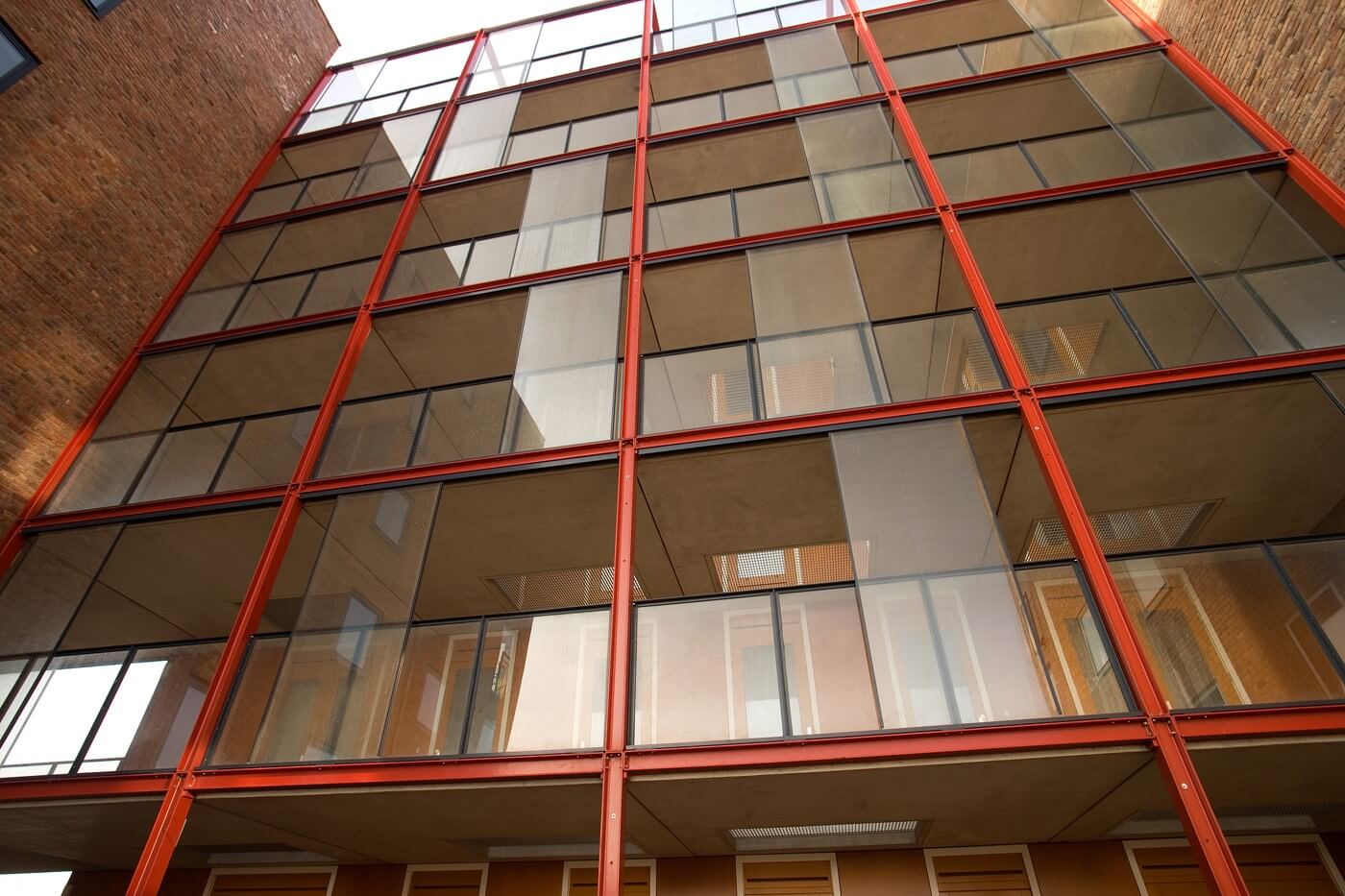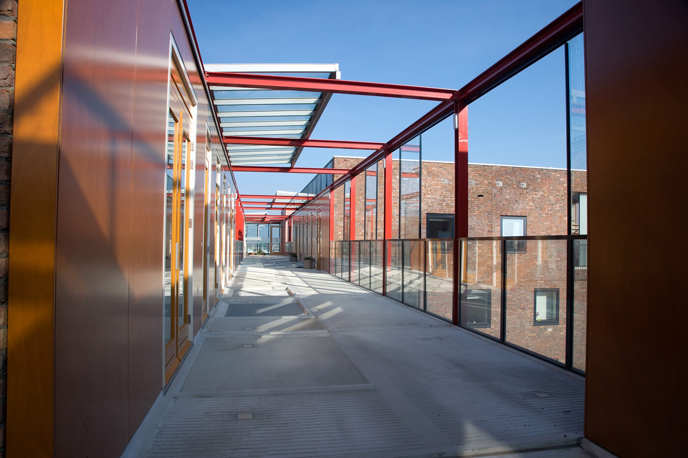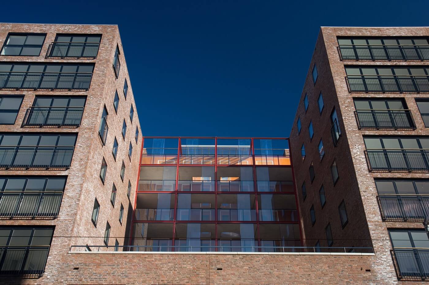 ‘Wel iets anders dus dan de gemiddelde galerij’, aldus Marian van der Waals. ‘De roosters zorgen niet alleen voor licht, maar ook voor afstand tot de gevels, zodat je niet zomaar bij de buurman op zijn bord kijkt. Dankzij de schuivende panelen kunnen bewoners zelf kiezen of ze de wind willen voelen of niet. Tegelijk zorgt dat voor een zekere onregelmatigheid en levendigheid in het geheel.’ De trappenhuizen en liftschachten aan beide zijden van het complex vormen de beëindiging van de ruggengraat. De trappenhuizen zijn ook weer van glas met dunne stalen omkadering. Van der Waals: ‘Het is echt een gebouw met een kop en een staart. Ik vind het mooi om te zien hoe het zich spiegelt in de haven – en in zichzelf.’