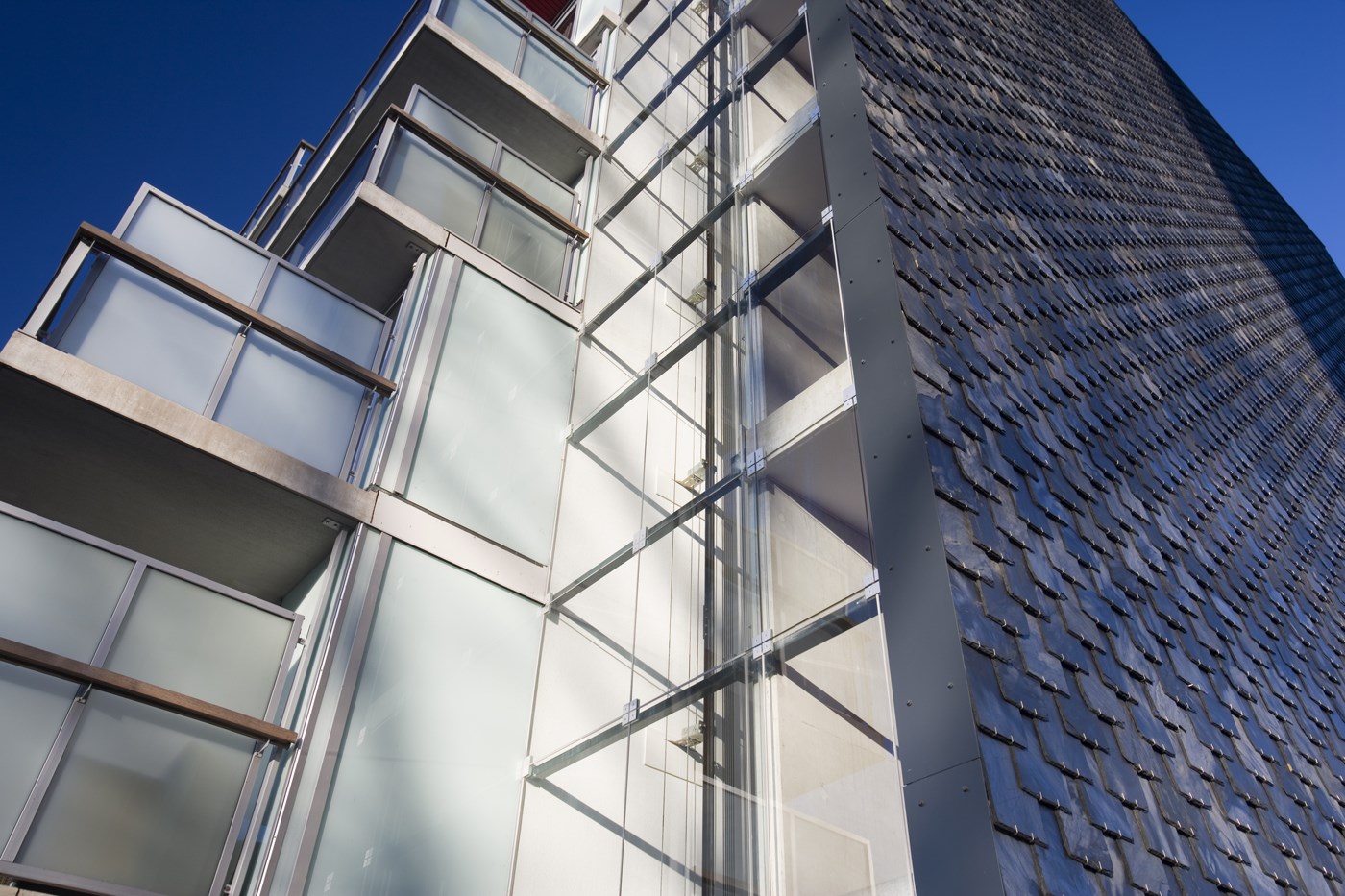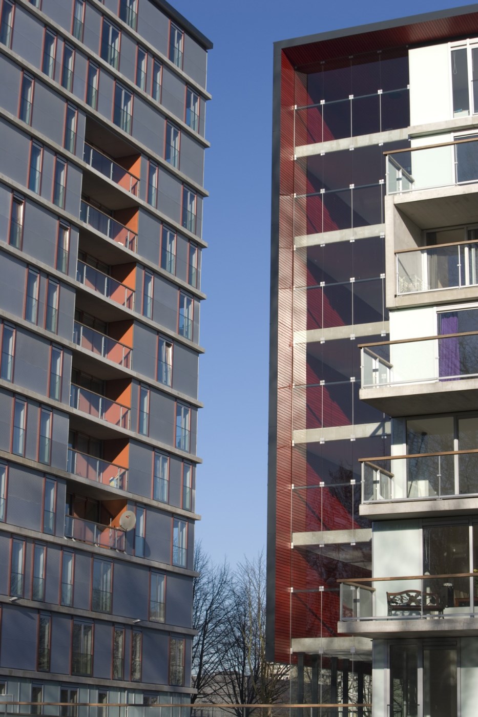 De ‘achterkant’ ligt aan water en een park en vangt veel zonlicht. Daar bevinden zich de balkons, terrassen en steigers. ‘De balkons liggen niet recht boven elkaar. Daardoor krijg je een gevoel van vrijheid. Zeker met het mooie uitzicht’, zegt Alewijnse. Bijzonder zijn de trappenhuizen: bijna volledig van glas, niet alleen omwille van de lichtinval, maar ook uit het oogpunt van sociale controle. En daar, besluit Alewijnse, wijkt De Stadstuinen misschien nog wel het meest af van zijn naoorlogse inspiratiebron. ‘Geen somberheid, maar vrijheid.’