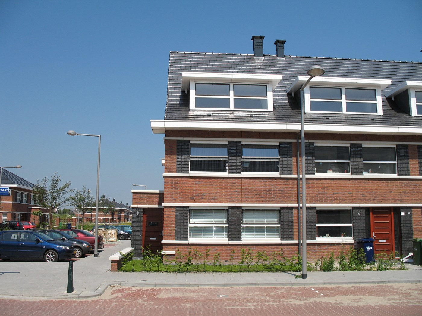 De Dromerdijk-afgeleide heeft dan ook een onmiskenbare ‘prairie’-signatuur met grote overstekken, talrijke uitbouwen en geaccentueerde entreepartijen. Uit de detaillering en de toegepaste materialen spreekt de hedendaagse inkleuring. ‘Aanvankelijk zocht ik naar glans en had ik het plan geglazuurde producten toe te passen’, vertelt Molenaar. ‘Maar dat bleek bij nadere beschouwing teveel van het goede. Uiteindelijk heb ik in overleg met de stedenbouwkundige een warm gekleurde, licht gevlamde baksteen en een donkere geëngobeerde steen en dakpan toegepast. Ze hebben allebei de zweem van glans en vullen de spiegeling van de beglazing mooi aan. Daarmee krijgen de woningen precies de uitstraling die we zochten.’
