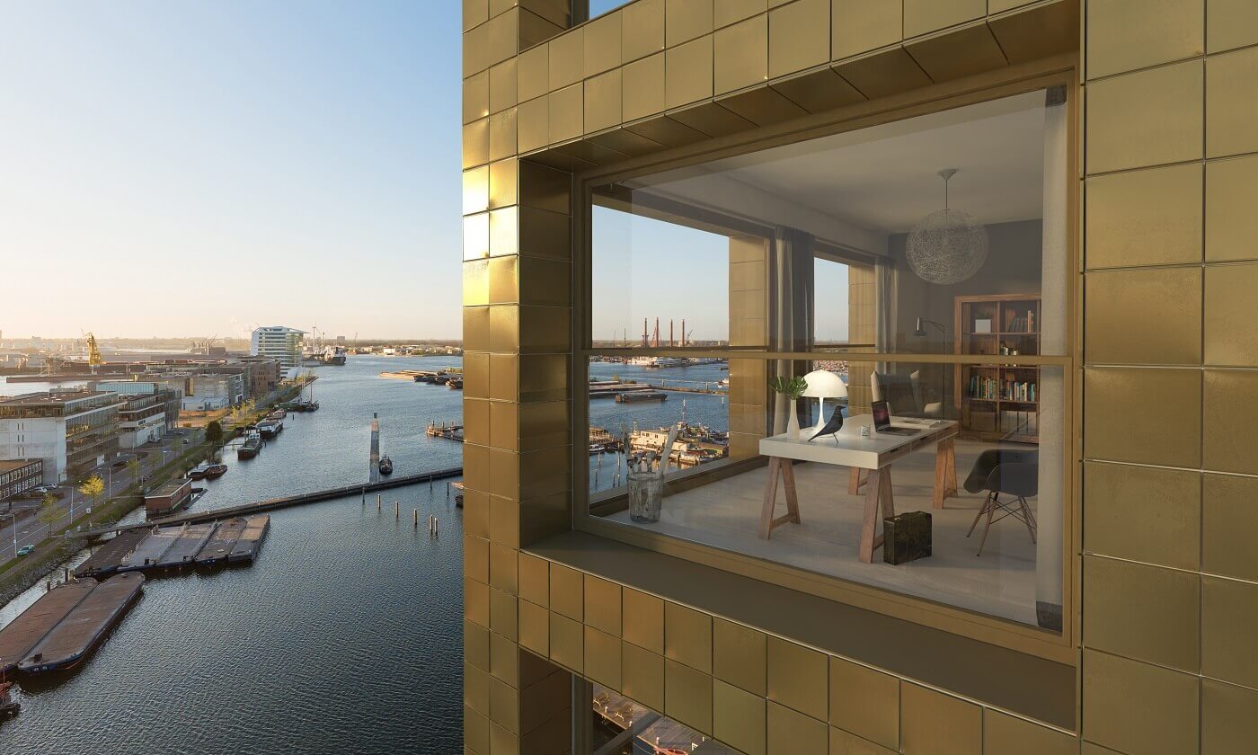Behalve blikvanger is Frame vooral ‘blikbieder’. Het robuuste gebouw staat op de kop van de Haparandadam en gunt de bewoners een prachtig panorama op Amsterdam en het IJ. Dat uitzicht bepaalde grotendeels het ontwerp van Van Dongen-Koschuch Architects. De verdiepingshoogte is minimaal drie en maximaal vier meter op de bovenste verdieping. De raampartijen gebruiken deze hoogte volledig.