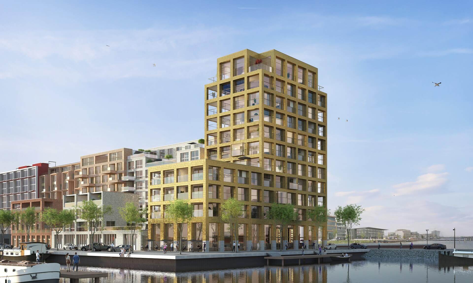 In een haven is altijd lawaai. Frame bevindt zich op de kop en functioneert als een geluidbuffer voor de bebouwing erachter. De havenzijde van het gebouw is dan ook uitgevoerd met beglaasde balkons.