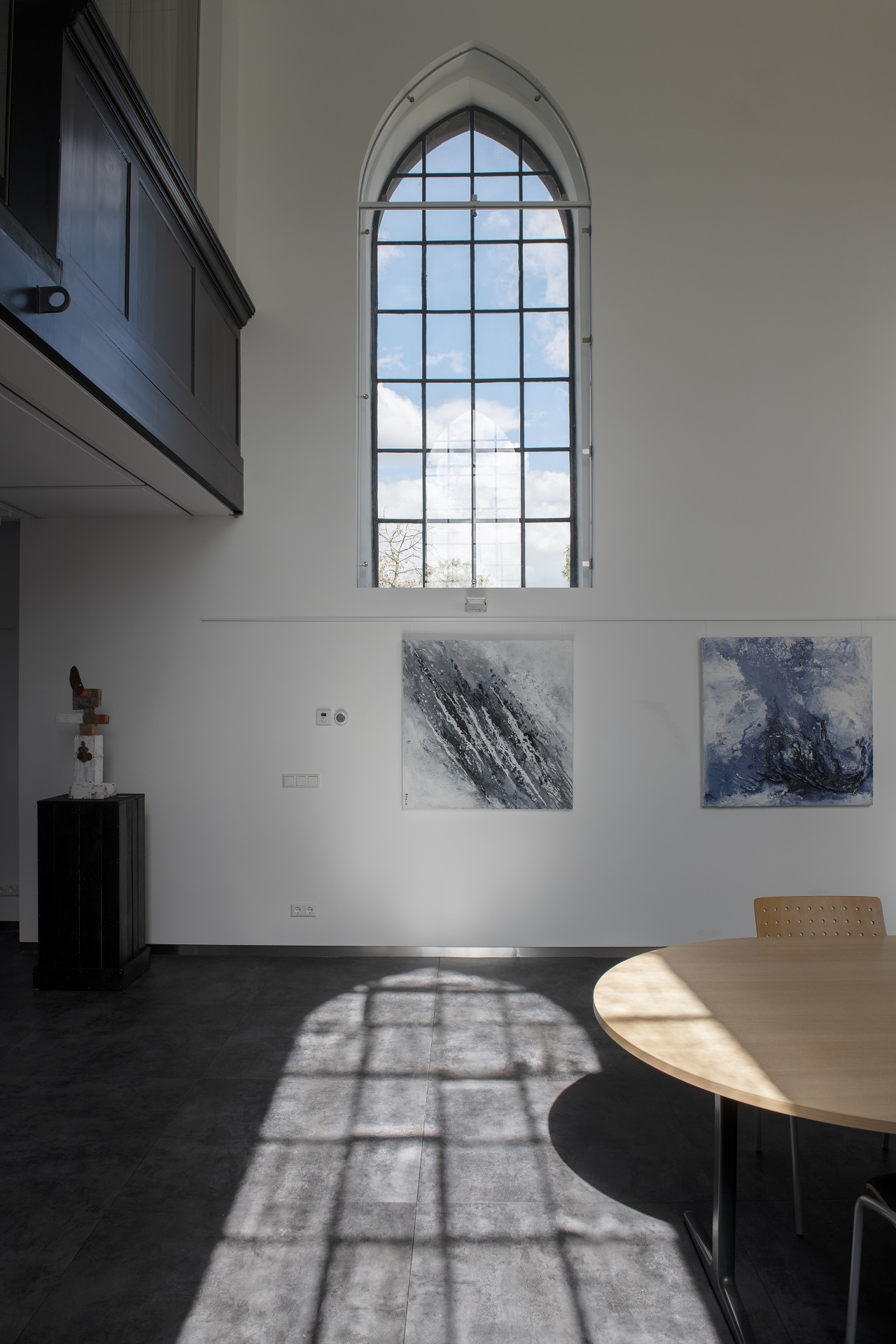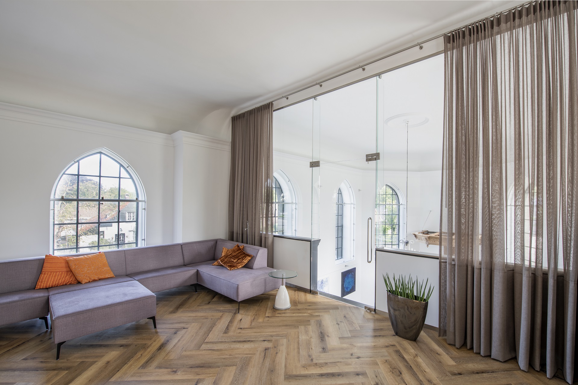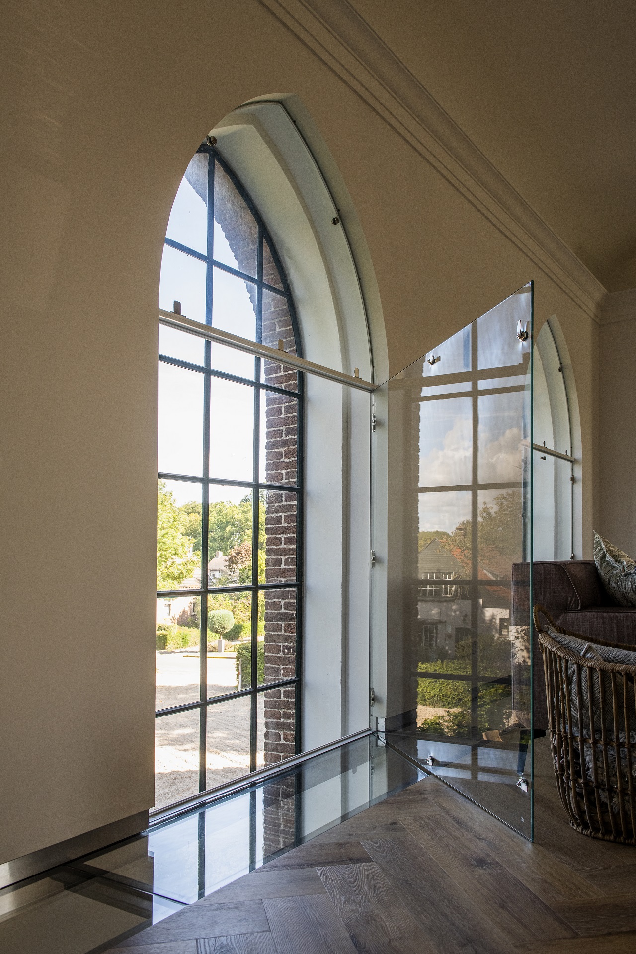 Op de eerste verdieping is het woongedeelte gecreëerd met een verdiepingshoogte van bijna vier meter (3,75 m). De woonlaag beslaat vrijwel het hele middenschip van de kerk. Een op maat gemaakte glazen wand en balustrades sluiten de verdieping volledig af van het onderliggende schip, dat is ingericht als multifunctionele ruimte. Of beter gezegd: ontmoetingsplek. ‘Ik vond het belangrijk om de maatschappelijke bestemming van de kerk te behouden. Er zou bijvoorbeeld kunst in geëxposeerd kunnen worden of diners worden gegeven, we werken nog aan deze ideeën.’ De kerk telt maar liefst tien verdiepingshoge ramen die de bewoners een schitterend zicht naar buiten bieden, onder meer op de rivier de Maas.