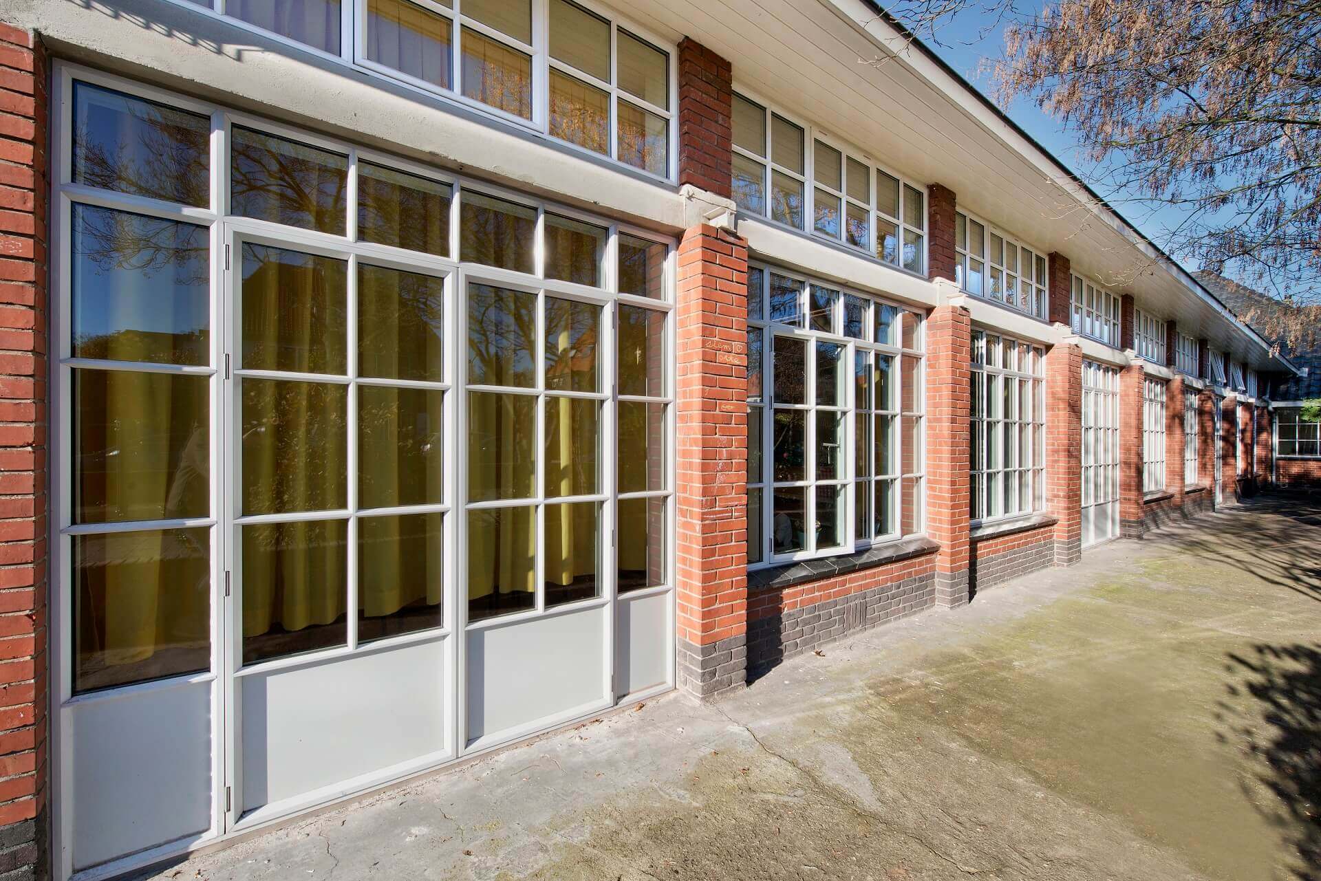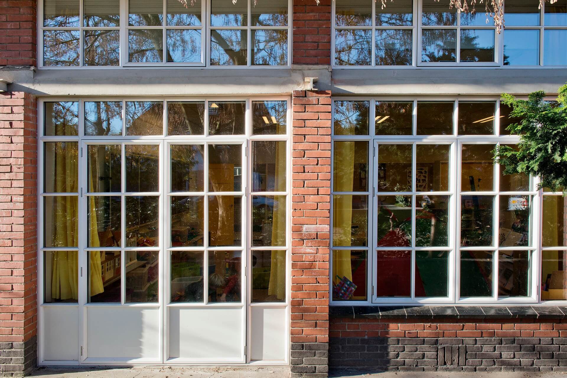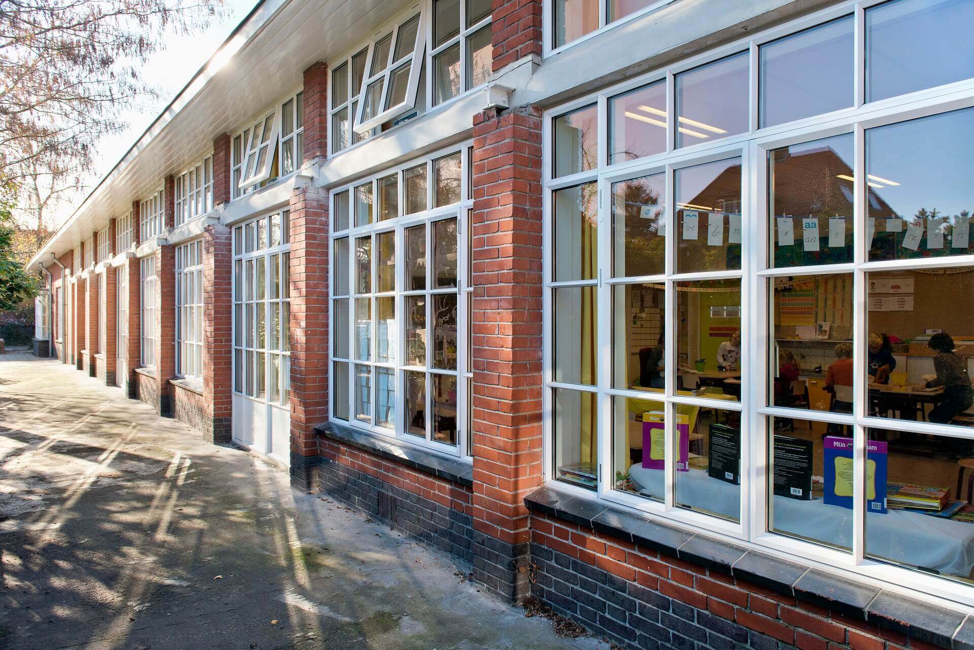 ‘De gemeente Hilversum (opdrachtgever, red.) wenste het comfort in de school en de klaslokalen sterk te verbeteren. Daarbij wilde ze de oorspronkelijke uitstraling van de school zoveel mogelijk intact te laten’, zegt projectleider Ronald Veltman van Van Hoogevest Architecten. Aan beide wensen is volgens hem voldaan door de originele stalen ramen te vervangen door ramen uit de Methermo Classiclijn van Metaglas. ‘Die komen qua afmetingen heel dicht bij het originele stoeltjesprofiel en zijn voorzien van HR++ glas en een geïsoleerd aluminium profiel. Die zorgen voor optimale isolatie van de ramen.’