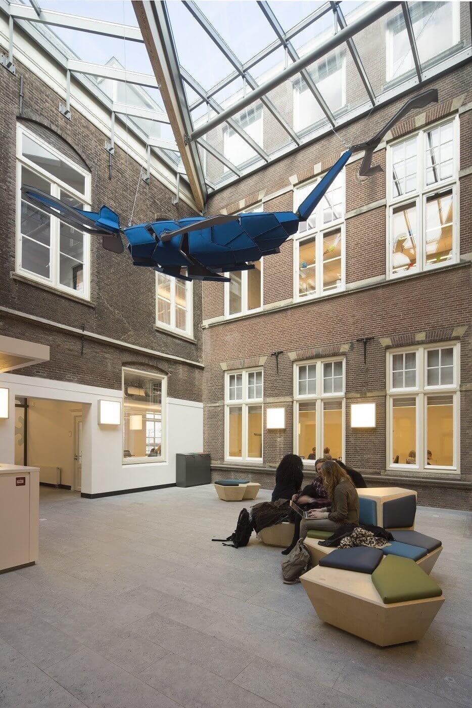 De nieuwbouw is geslaagd. Dat is af te lezen aan de aantallen studenten die vanaf dag een na de opening al hun eigen plek hebben gecreëerd. Een verrommeld ensemble is door slimme, duurzame keuzes van Marx&Steketee een uitnodigend en helder gestructureerd gebouw met prachtige constructies als een enorme houten trap en glazen daken boven twee patio’s. Een onderwijscomplex dat zeker tot de opening van de geplaatste tijdcapsule in 2116 zal voldoen.