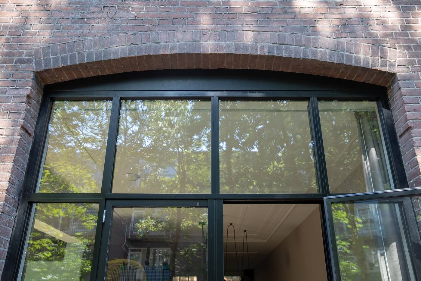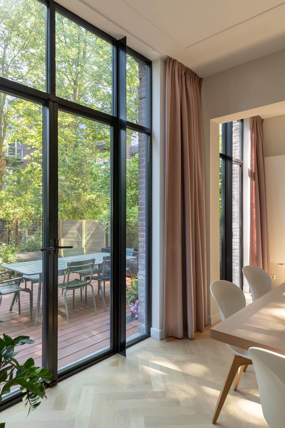 Om een woonkeuken te creëren is de wand tussen de achterkamer en oude keuken doorgebroken. Op de begane grond is de ensuite verwijderd en heeft het plaatsgemaakt voor een maatwerk keuken. De originele glas-in-lood schuifdeuren zijn hergebruikt tussen hal en woonkamer. De oorspronkelijke oude pui aan de achterzijde heeft plaats gemaakt voor Methermo®XL inbraakwerend naar buiten draaiende raam met een geïsoleerd aluminium kozijn. Door de draaiende ramen, deuren en vaste ramen modulair met elkaar te combineren, is er een mooi harmonisch geheel ontstaan. De slanke aluminiumroeden van het systeem geven de woning een ‘steellook’ dat past bij de authentieke onderdelen van de vooroorlogse woning.