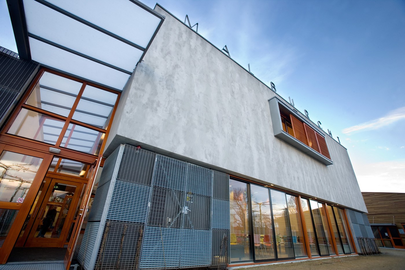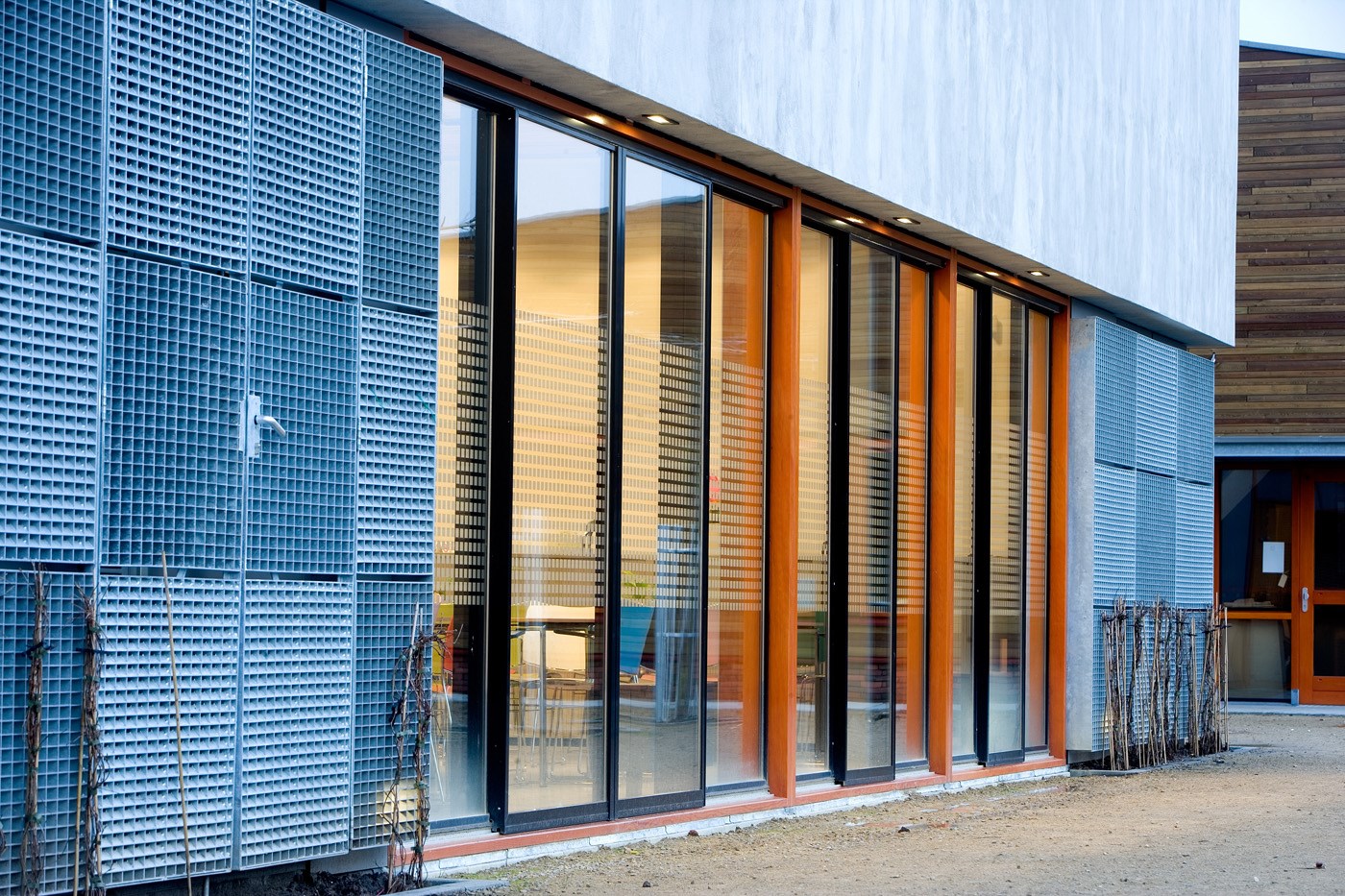 De gebruikte materialen geven het gebouw iets onverzettelijks - de indruk dat het tegen een stootje kan eigenlijk. Des te belangrijker was het volgens Otto van Dijk om zorgvuldig om te gaan met de details. ‘Alle zonwering en ventilatieroosters zijn bijvoorbeeld ‘weggedetailleerd’ in de kozijnen van Oregon pine-hout. De slanke omlijsting van de Metaglas-producten zorgt voor een nog transparantere indruk. Bovendien contrasteren de vensters prachtig met de natuurlijke kleur van de kozijnen en de gevelbekleding.’ En dat is niet het enige contrast. Van Dijk: ‘De afwerking van het interieur is sober; ook daar heb ik de natuurlijke kleuren laten spreken. Behalve in de toiletgroepen en de kleedkamers: die hebben allemaal een eigen kleur en slingeren als een bonte kralenketting door het gebouw.’