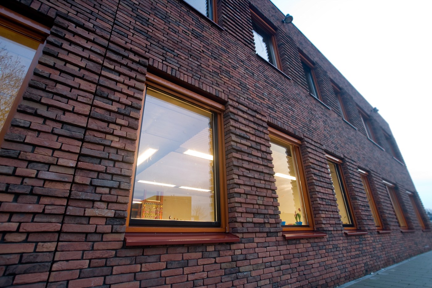 Architect Otto van Dijk laat de in de gevels gebruikte materialen - metselstenen, ‘betonlook’ stucwerk, houten belatting en metalen roosters met klimplanten in de groei - voor zichzelf spreken. Die afwisseling zorgt ervoor dat het complex nergens massaal aandoet en dat buitenruimtes in elkaar overvloeien. De teruggelegen entree, tegelijk buurthuis en uitvalsbasis voor de thuiszorg, geeft het gevoel dat Malburcht je omarmt. De grillige, dunbed gemetselde handvormstenen waaruit het grote L-vormige ‘schooldeel’ is opgetrokken, geven een warme indruk; ze lijken sterk op de stenen die jaren geleden in de omliggende bebouwing werden gebruikt. De poot van de ‘L’ wordt voorbij het midden onderbroken door de eveneens basale vierkante sportzaal. Feitelijk los van het geheel staat het bouwdeel waarin de peuterspeelzalen en de kinderopvang zijn gerealiseerd. Het is bekleed met Siberisch lariks, een houtsoort met een robuust maar verfijnd uiterlijk.