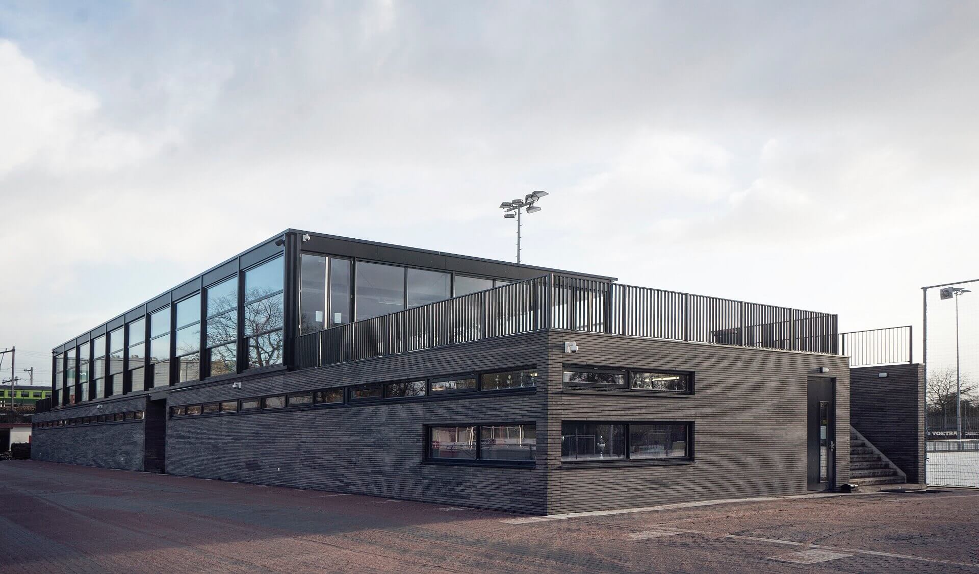 De gevel van de skybox is een doorlopend verticaal schuifraam dat volledig te openen is waardoor een grote buitentribune ontstaat. Door de uiterst slanke raamprofielen (4 cm) van de Methermo®XL verticale schuiframen, hadden de supporters een perfect uitzicht op het hoofdveld. Het transparante clubhuis is onderdeel van een nieuw kleedkamer- en kantinecomplex. Het staat op het kleedkamergebouw waarin ook ruimten zijn voorzien voor een krachthonk, fysiotherapie en wedstrijdsecretariaat.