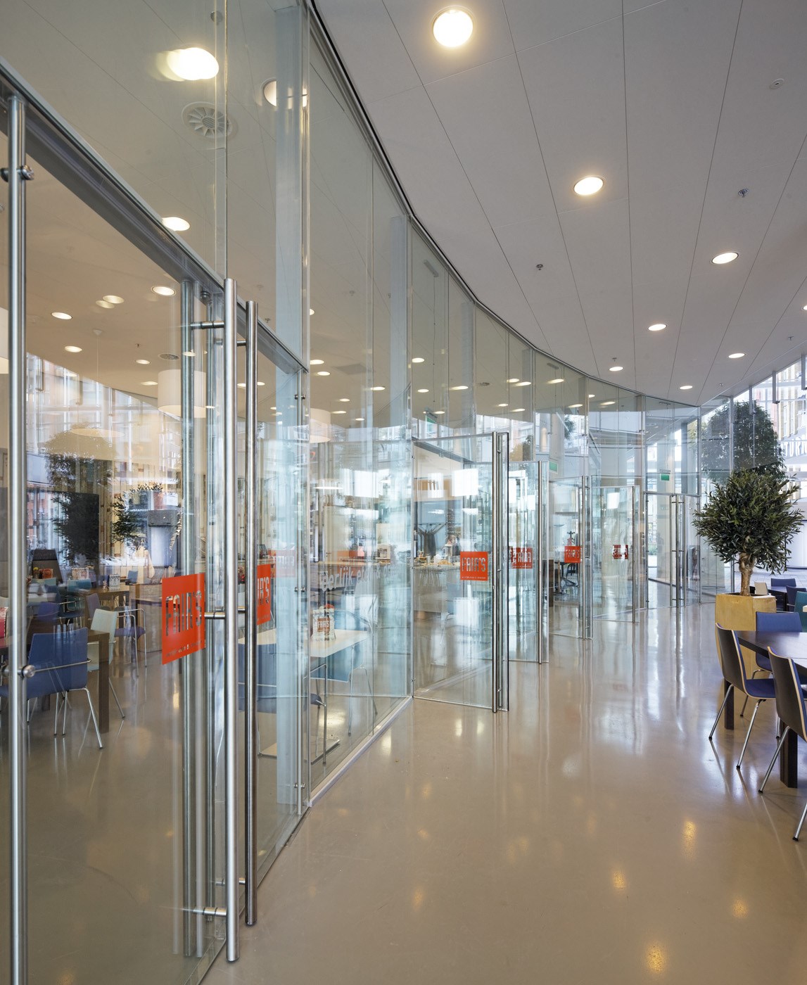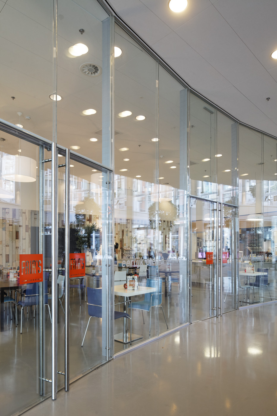 De deels gebogen glazen scheidingswand op de begane grond ziet er niet uit als een technisch hoogstandje, maar is dat wel degelijk. De dertig meter lange, uitzonderlijk hoge wand (4400-4750 mm) scheidt het atrium van verschillende andere ruimtes zoals een lunchroom en de Burgerzaal (trouwzaal). Gezien de bedrijvigheid in de hal was optimale geluidwering dus een voorwaarde, terwijl er wel openslaande deuren in de wand moesten komen. In de filosofie van architect Kim Herforth Nielsen komt bovendien in gebouwen van zijn hand zoveel mogelijk licht binnen. Die drie voorwaarden zijn samengebracht in een volledig glazen wand met glazen deuren die het daglicht onbelemmerd binnen laat stromen en geluid weert tot maar liefst 45 dB.