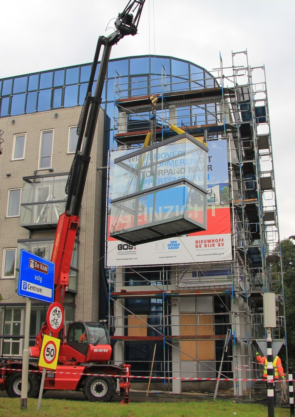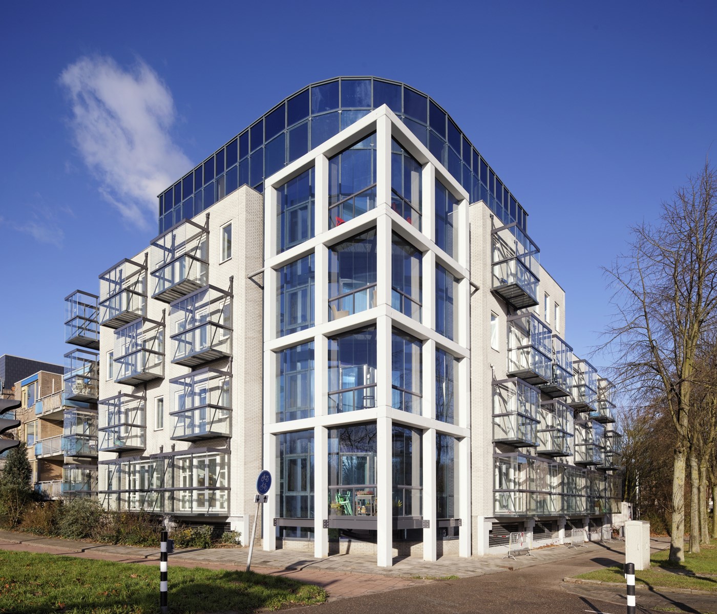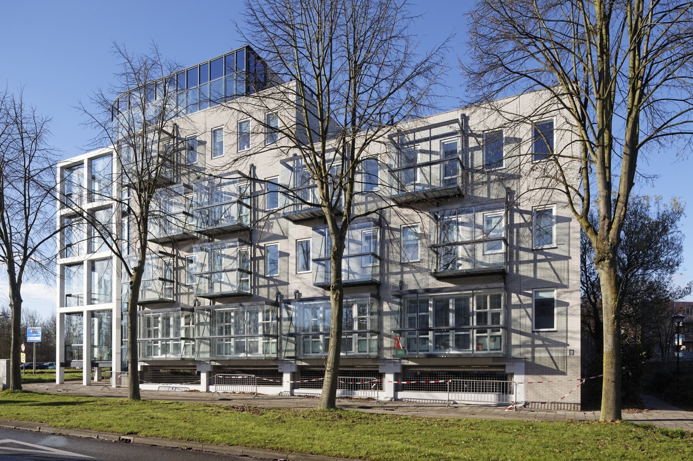 Dit kantorengebouw is getransformeerd naar woningen. De speciaal ontwikkelde prefab glazen balkons zorgen voor verandering van het gevelbeeld, een aangename buitenruimte en geluidswering op de gevel.