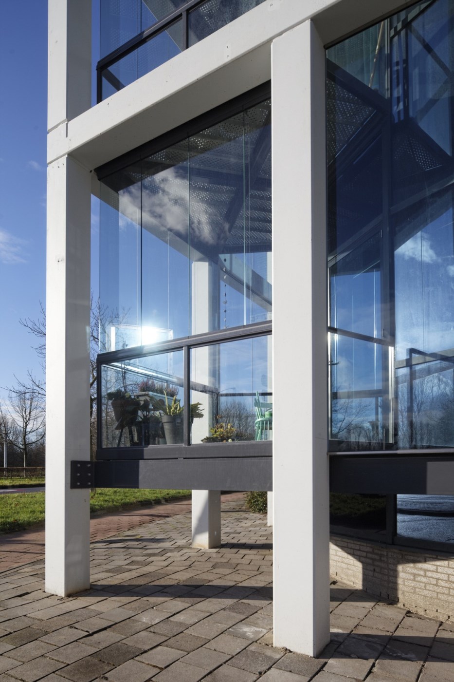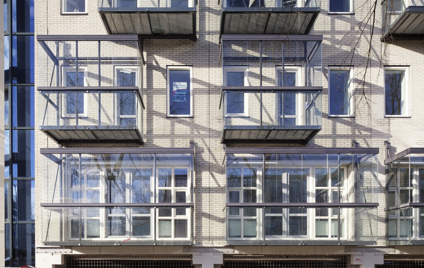 De bouwkundige en ruimtelijke kwaliteit van het kantoorgebouw waren volgens projectarchitect Pascal van Loosbroek prima in orde. ‘Maar om het geschikt te maken voor bewoning, moest het voldoen aan normen op het gebied van gevelkwaliteit, de toetreding van daglicht en het geluidsniveau vanaf de straat. Met andere woorden: het moest minder op een kantoor lijken, een open aanblik houden en een extra barrière tegen geluid van buiten krijgen.’ Het ei van Columbus vond de architect in overleg met Metaglas: ‘Prefab glazen balkons die aan de gevel zijn gemonteerd.’ Ze zorgen voor een levendig gevelbeeld en geven meer ‘woonuitstraling’, maar feitelijk zijn het geluidsserres. Door ze te voorzien van balkonbeglazing, weren ze omgevingslawaai uit de woningen en creëren we meteen bruikbare buitenruimte voor de bewoners.’