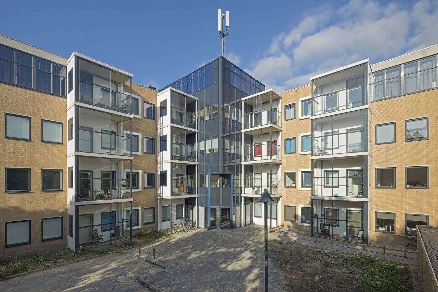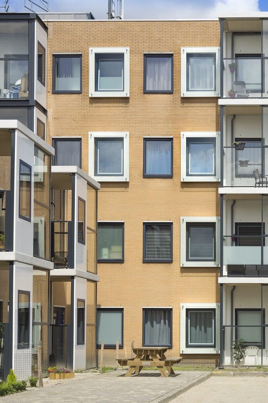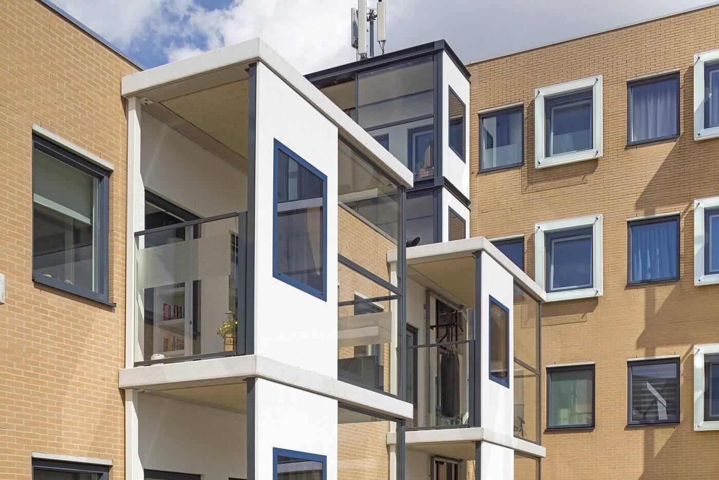 ‘Als leverancier van ramen en glasconstructies zijn we veel betrokken bij transformatieprojecten. Dat zijn specifieke projecten met specifieke wensen. Wij wilden de uitdaging aangaan – in samenwerking met adviesbureau LBP Sight – om een goede oplossing te creëren voor geluidsreductie op gevels’, vertelt Waldo Duin van Metaglas. Dat is in dit geval gedaan voor een transformatieproject van A3 architecten en Jutphaas Wonen in Nieuwegein. De basisgedachte was om een glazen scherm voor het raam te zetten. Dat zou in theorie een geluidsreductie van 5 decibel op de gevel opleveren. ‘Maar dat viel in de praktijk tegen, de reductie was nihil’, zegt Duin. ‘Het omgevingsgeluid ging tussen de gevel en het scherm zitten, waardoor het juist extra ging resoneren.’ De oplossing werd gevonden in het aanbrengen van een glazen scherm met één of meerdere coulissen (lagen) rondom het raam.