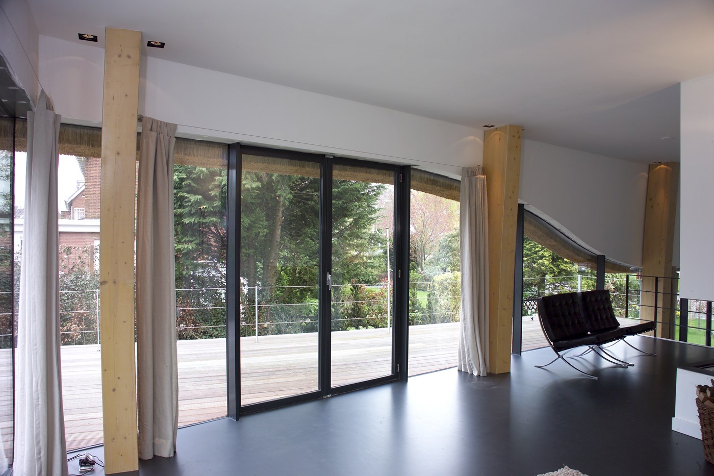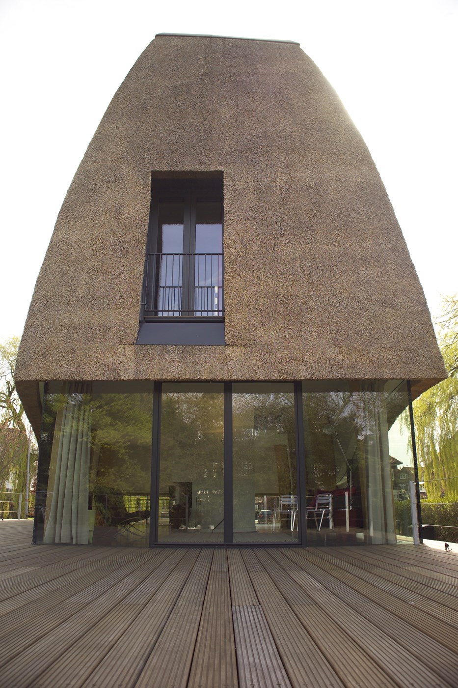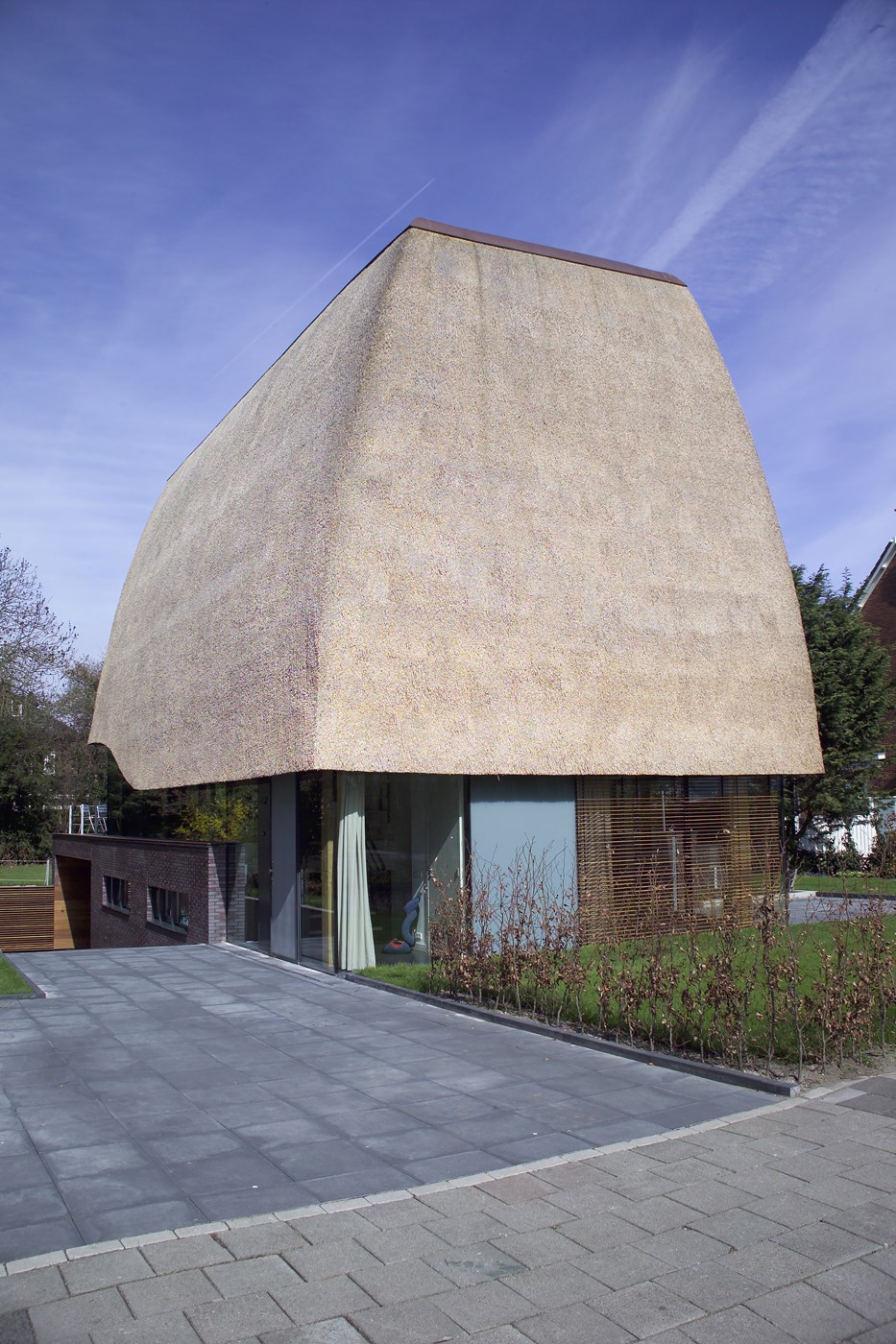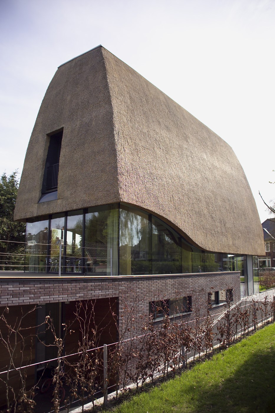 Architect Nynke Joustra van Joustra Reid Architecten uit Amsterdam zette een opvallend ontwerp op papier: een villa met een robuuste, vrijwel gesloten rieten kap en al even forse bakstenen plint met daarin een omvangrijk souterrain. De begane grond en de bel-etage (de halfverhoogde etage op het souterrain) zijn juist omgeven door glas. Dankzij deze rondom toegepaste gelijmde Total Glas panelen lijkt de kap boven het maaiveld te zweven. Alleen de gekromde, gelamineerde houten spanten die oprijzen uit het souterrain en de constructie dragen, verraden dat dat niet zo is.
