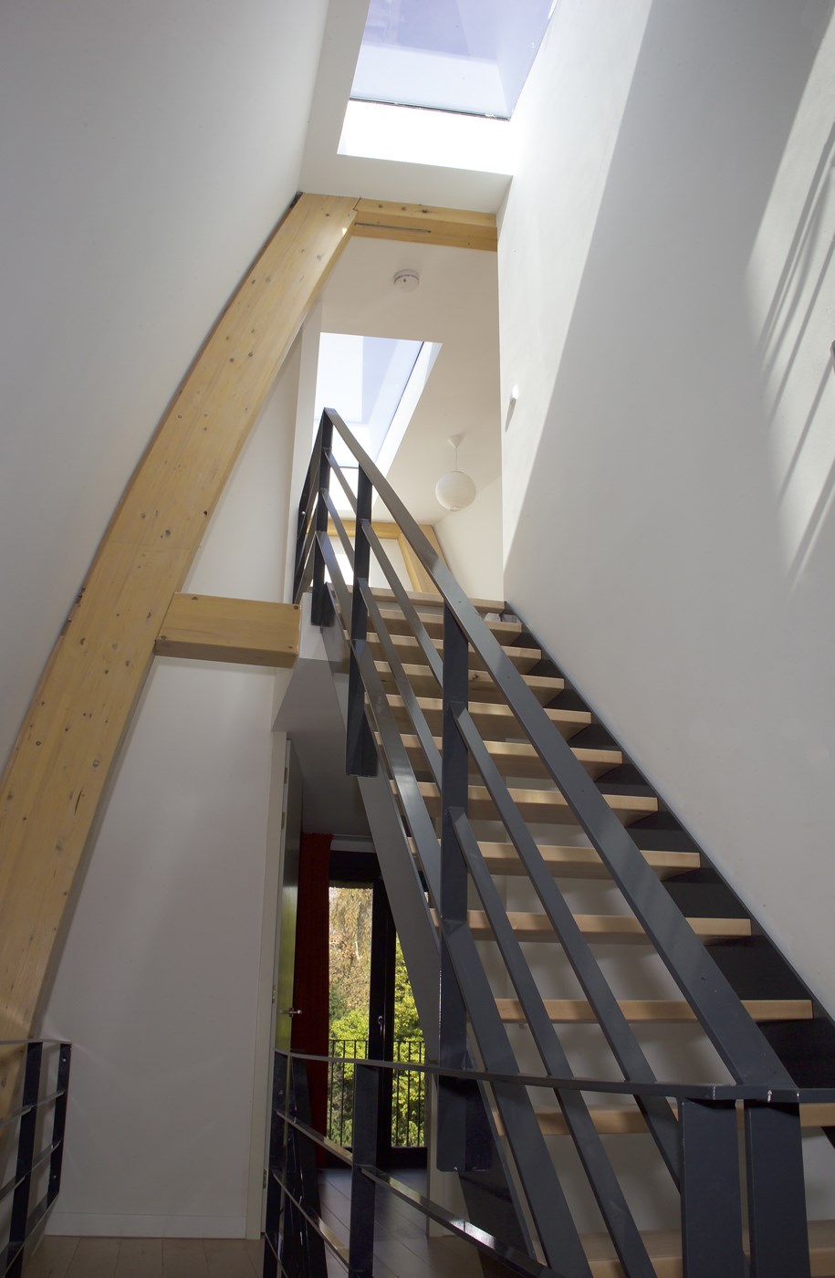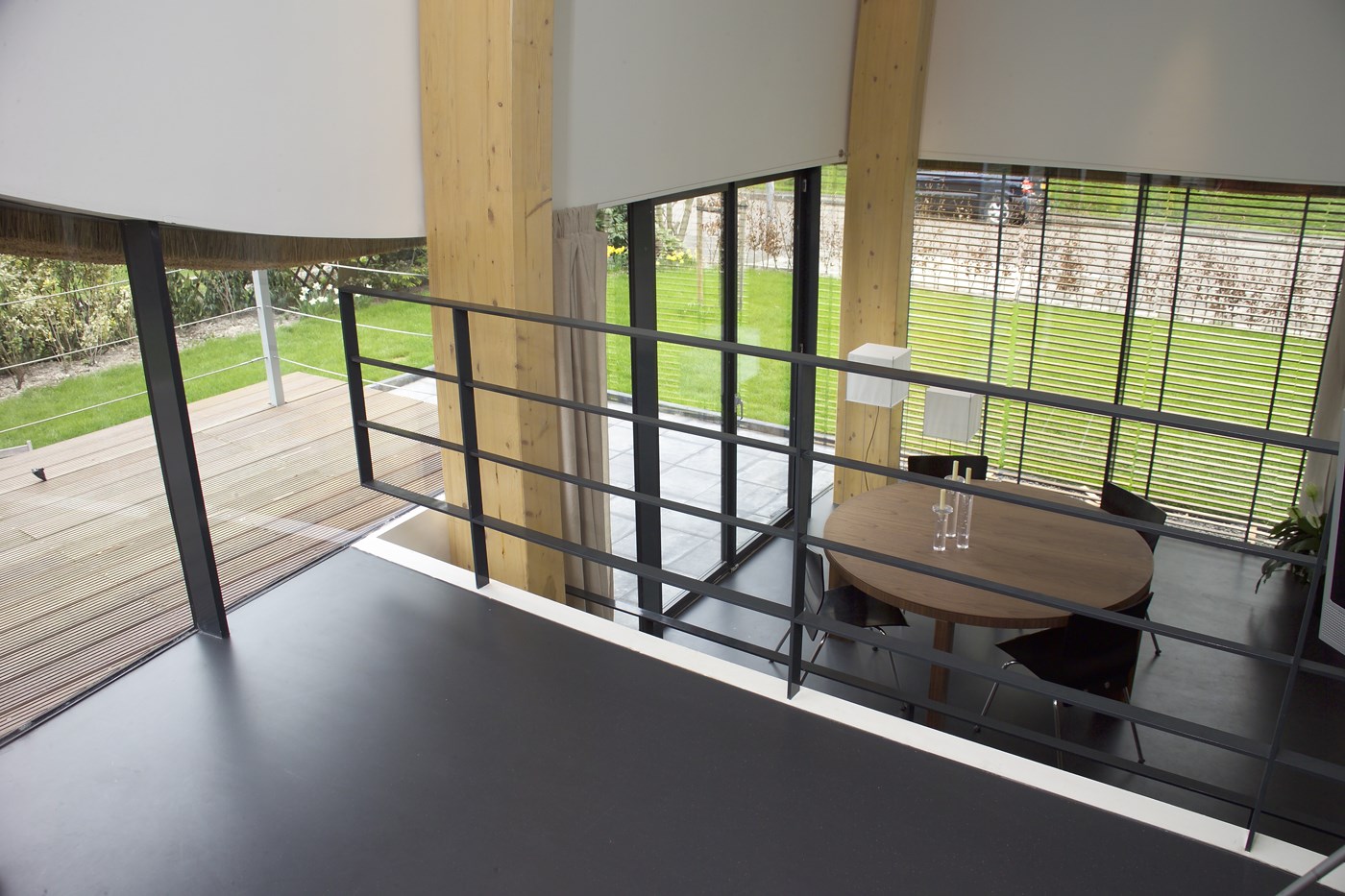Bijvoorbeeld op de houten spanten die binnenshuis bijna overal zichtbaar zijn. Via grote openslaande Total Glas-deuren hebben de leefruimtes een directe relatie met de tuin; het terras is aangelegd op het uitstekende deel van het souterrain.’