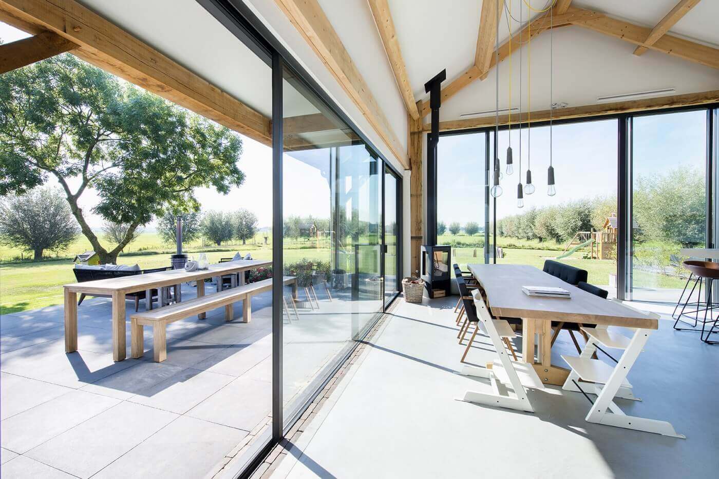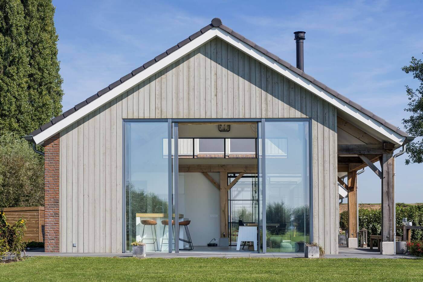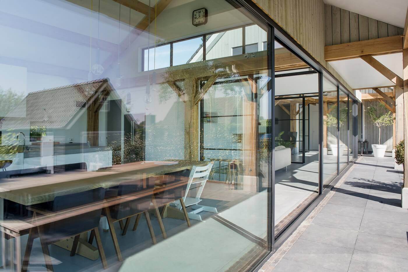 Het schuurconcept vertaalt zich binnen door op poeren geplaatste, grote, eikenhouten spanten. Deze zijn in het zicht gelaten net als de overige houten draagconstructie. Deze traditionele elementen contrasteren mooi met de transparante achterzijde. De architect kon de vastgelegde inhoud van de nieuwbouw door de mogelijkheden voor vergunningsvrij bouwen en aanbouwen volledig te benutten, bijna verdubbelen. De zestien meter lange glazen achtergevel verbindt het hoofdmet het bijgebouw. Door een aantal dwars op deze gevel geplaatste glazen tussenwanden valt er veel licht de woning binnen en ontstaan lange zichtlijnen.