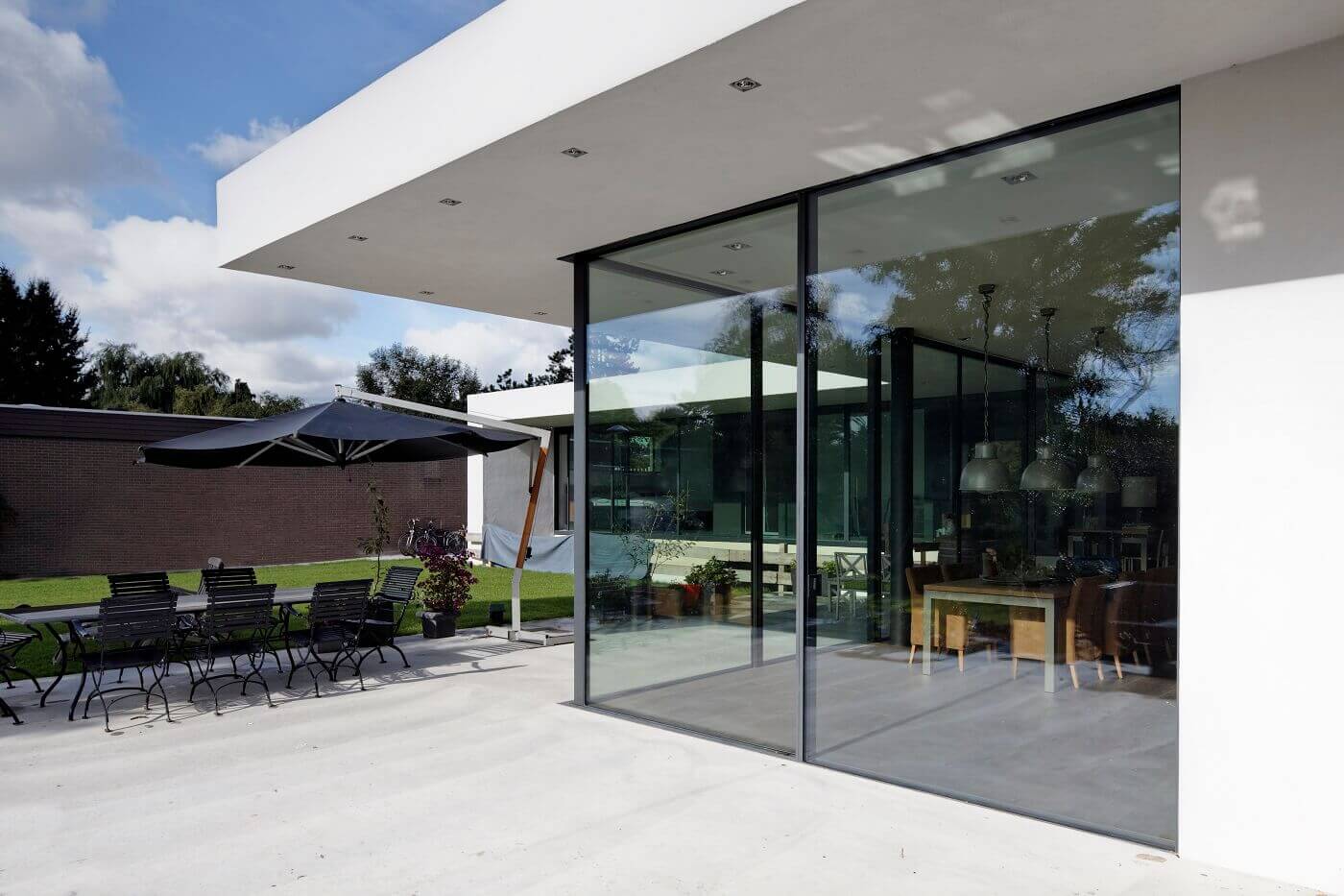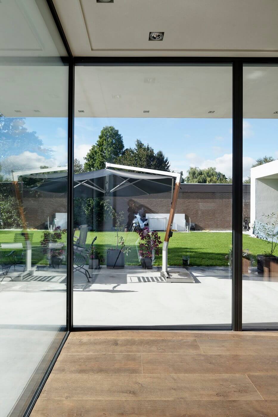 Deze villa met half verzonken souterrain in Utrecht valt op vanwege zijn geringe hoogte, strakke lijnen en gestuukte lichte muren. ‘De maximaal toegestane hoogte was 4,50 meter’, vertelt ontwerper, aannemer en bewoner Jan Willem de Bruin. ‘Het ontwerp heb ik samen met een net afgestudeerde architect gemaakt.’ De gevel aan de straatzijde is gesloten; de leefruimte, aan de zonkant, kijkt uit op de tuin. De grote glazen pui beslaat drie gevels van respectievelijk 12, 10 en 4 meter lang en kan in delen worden opengeschoven, ook op een van de buitenhoeken. De hoogte van de glaspanelen is maar liefst 3500 mm. ‘Het is net alsof je binnen ook buiten zit. Deze pui met zijn slanke profielen geeft een heel ruimtelijk gevoel.’