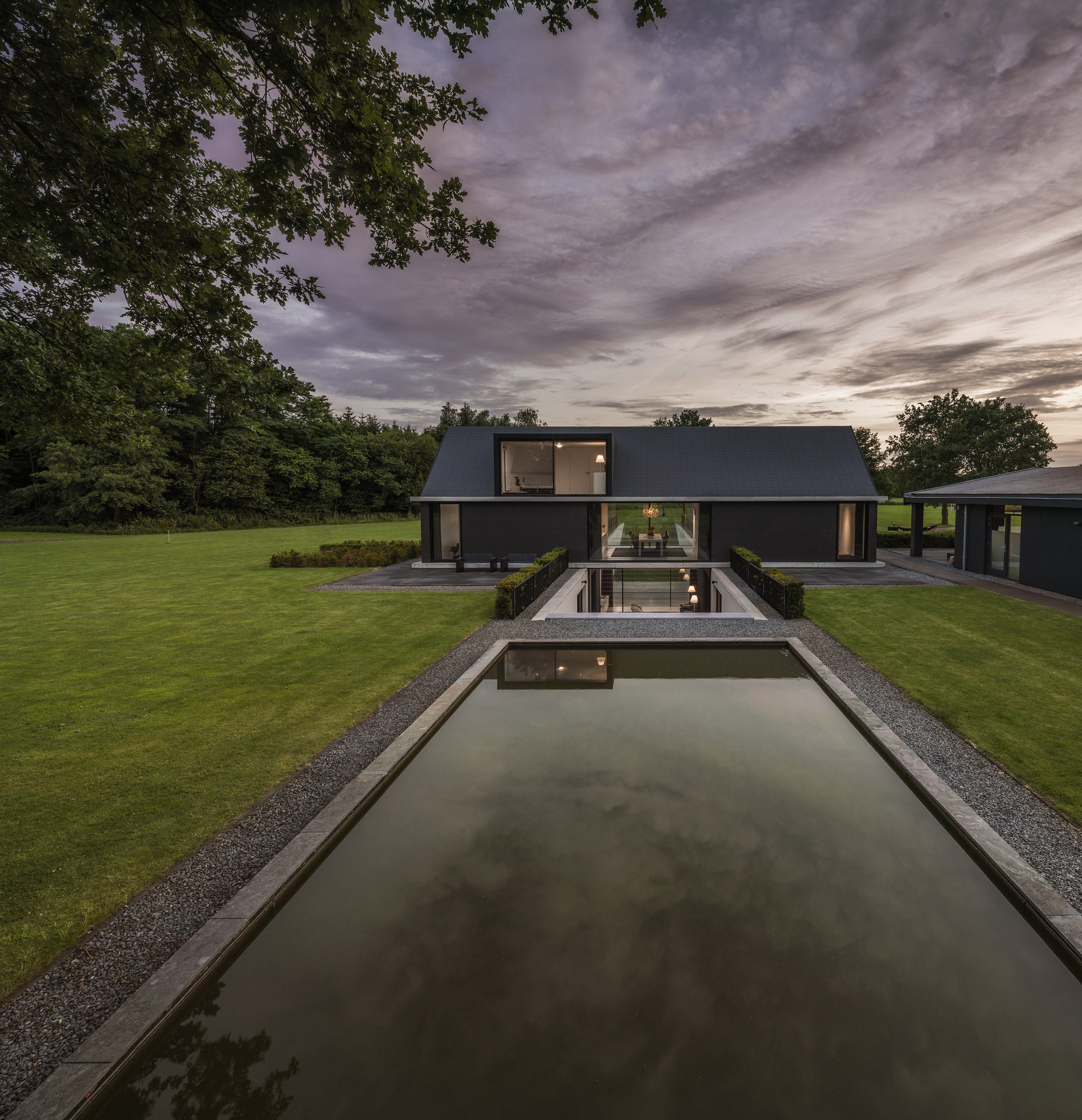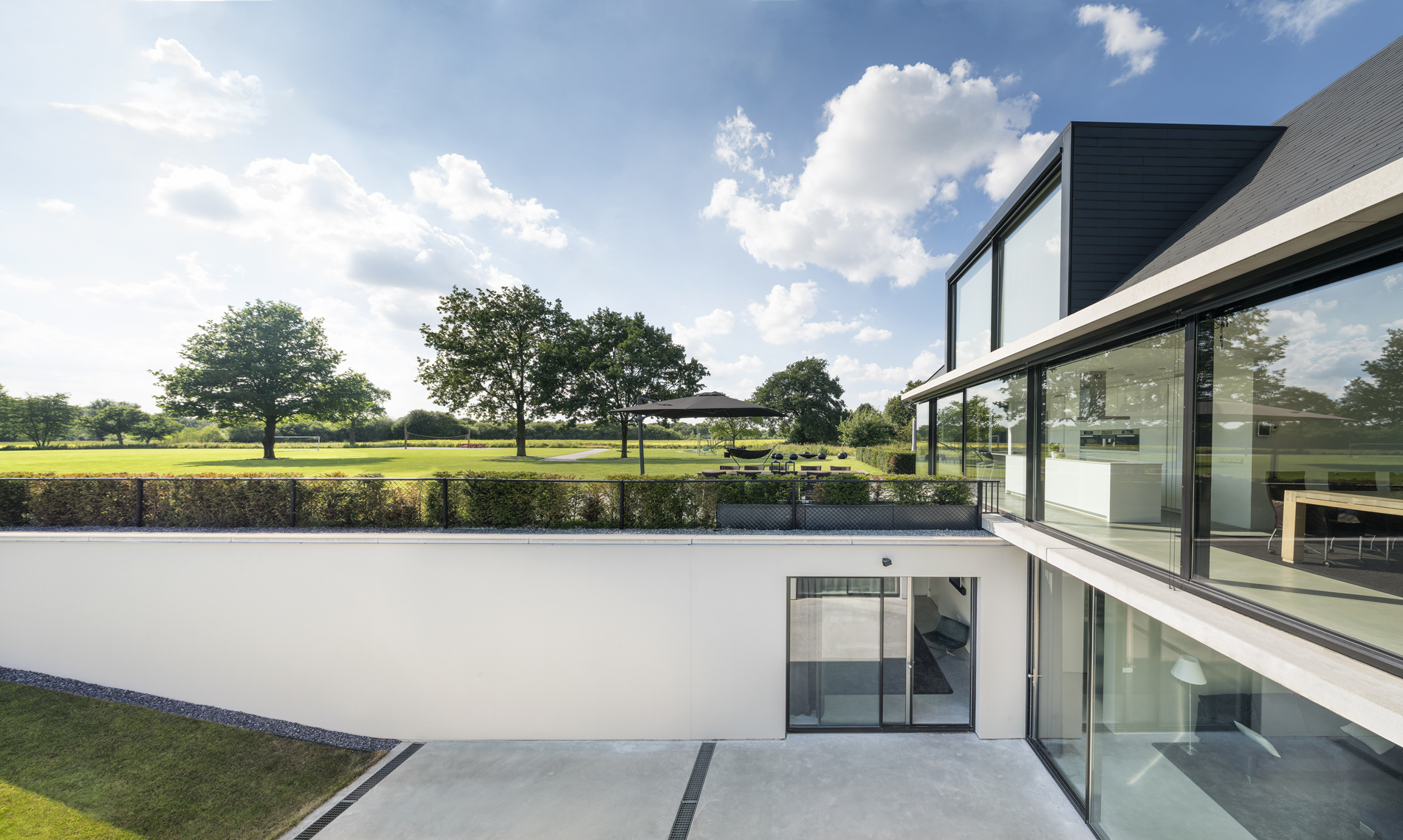 Tot slot benadrukt Michiel Hofman het belang dat zijn bureau hecht aan de verbinding tussen binnen en buiten. Bij deze villa speelt de hellingbaan daarin een sleutelrol: die ‘verankert’ de woning in het landschap. ‘De helling ziet er nu nog architectonisch uit. Straks, als hij begroeid is, vouwt het landschap zich als het ware naar beneden. Elke kamer komt dan direct uit op de tuin en staat rechtstreeks in verbinding met de natuur. Je ziet de omgeving dus niet alleen goed, je kunt er ook meteen naartoe.’
