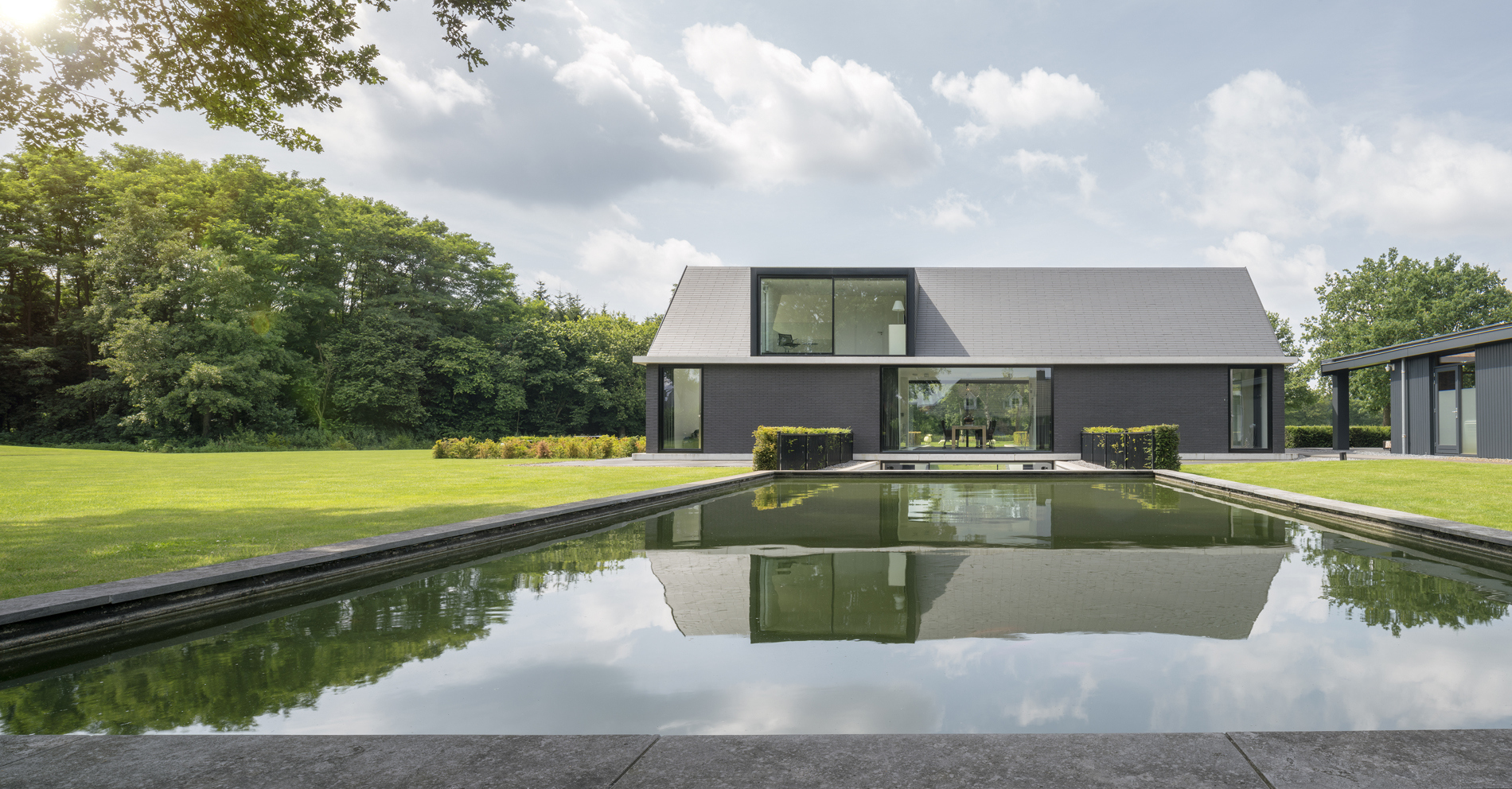 In het vrije veld even buiten Geldrop staat deze villa. Op het oog niet zo heel groot, maar schijn bedriegt: bijna de helft van het huis ligt onder het maaiveld. Donker? Allesbehalve. Het souterrain krijgt veel daglicht dankzij een langgerekte hellingbaan. Glas doet de rest en biedt bovendien prachtig uitzicht op de omringende natuur.