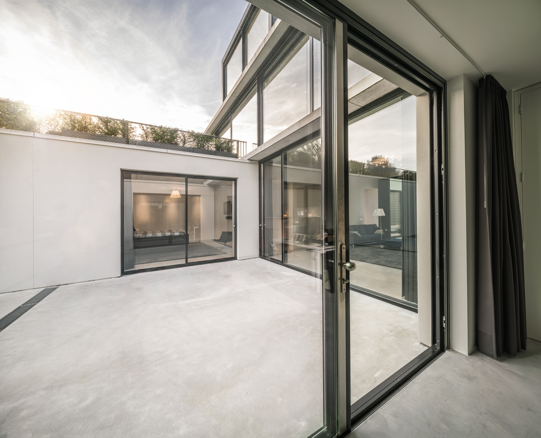‘Op het maaiveld was niet meer dan 650 kubieke meter bebouwing toegestaan’, vertelt projectarchitect Michiel Hofman. ‘Op zich geeft dat voldoende mogelijkheden voor een aardig volume, maar de opdrachtgever wilde graag meer. Vandaar dat we al in een vroeg stadium uitkwamen op een souterrain met daarin alle slaapkamers, badkamer en bergruimte. De hellingbaan met de verdiepte patio is de crux in het geheel: die zorgt voor daglicht over de noord-zuidas van de woning. Daarvan profiteren alle ruimtes onder het huis.’
