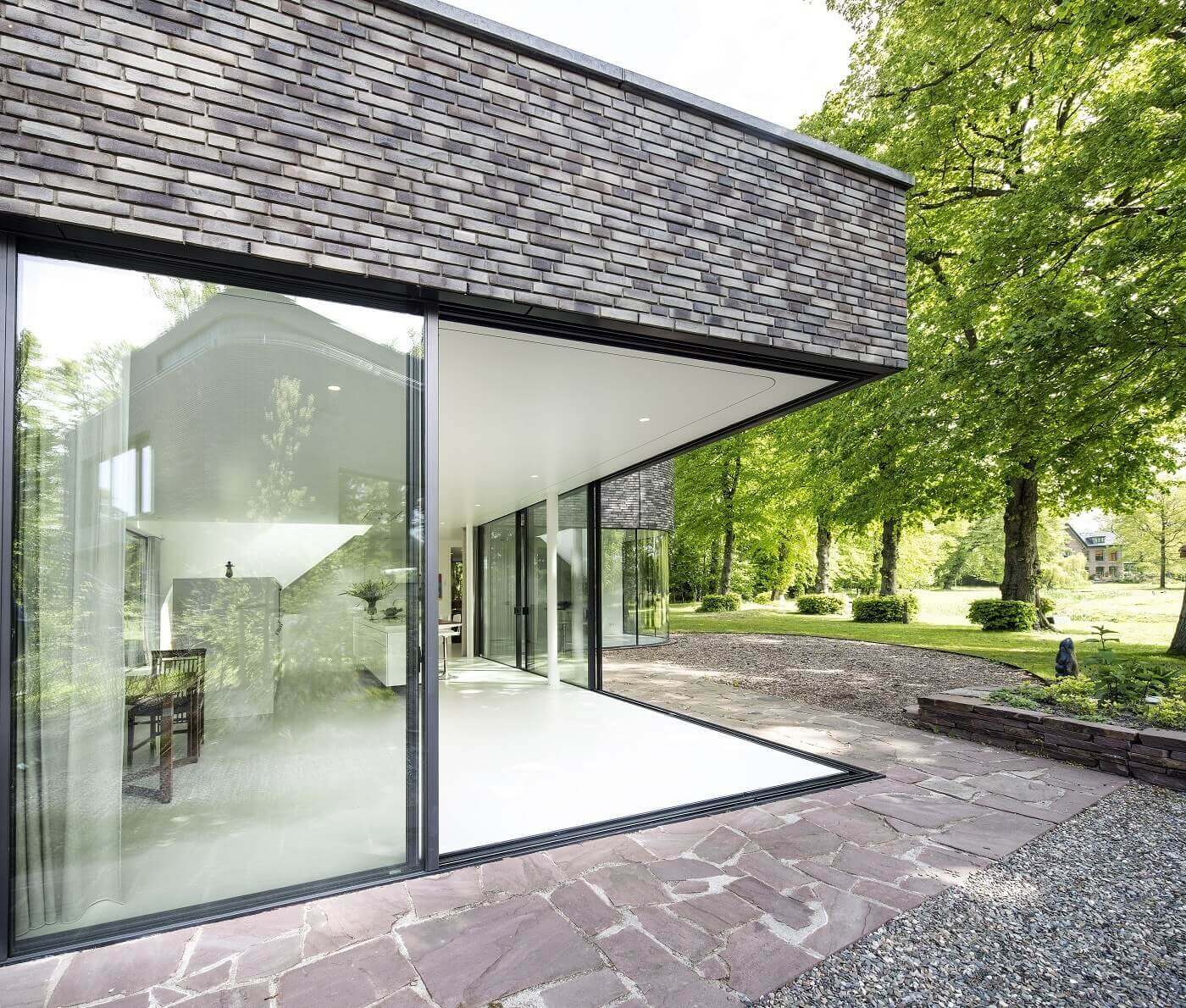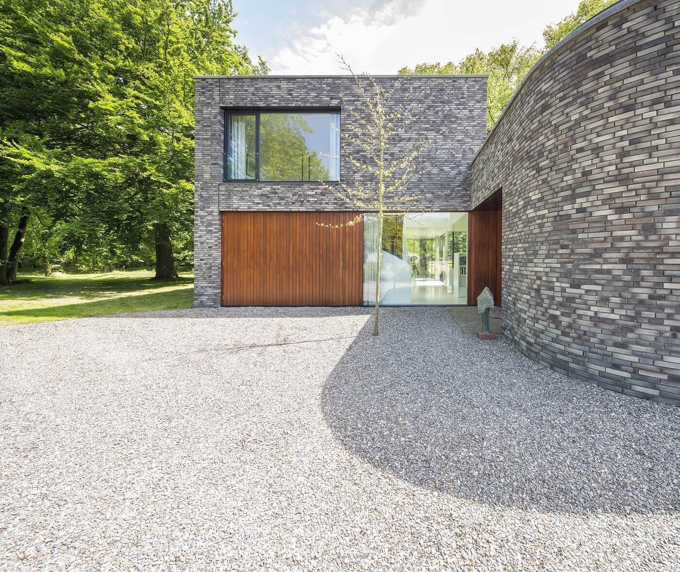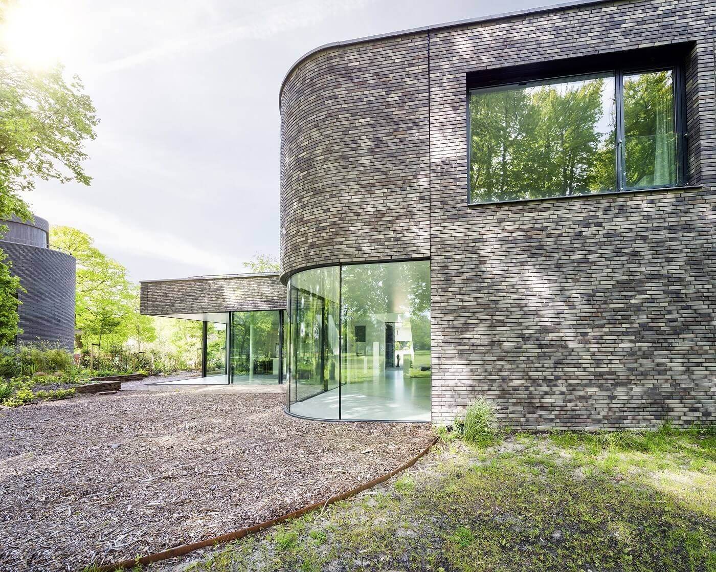 De villa op Park Brederode staat midden in het bos. Zo’n natuurlijke omgeving biedt alle ruimte om binnen- en buitenruimtes naadloos met elkaar te verbinden. Maar ook om in te spelen op de intuïtie van bewoners en bezoekers. Dat is precies wat Hofman gedaan heeft. Neem de krommingen in de pui van het huis. Hofman: ‘De ronde pui aan de straatzijde van het huis neemt je als het ware mee naar de entree. Aan de andere kant van de villa leidt het gebogen glas je op een natuurlijke manier de tuin in.’