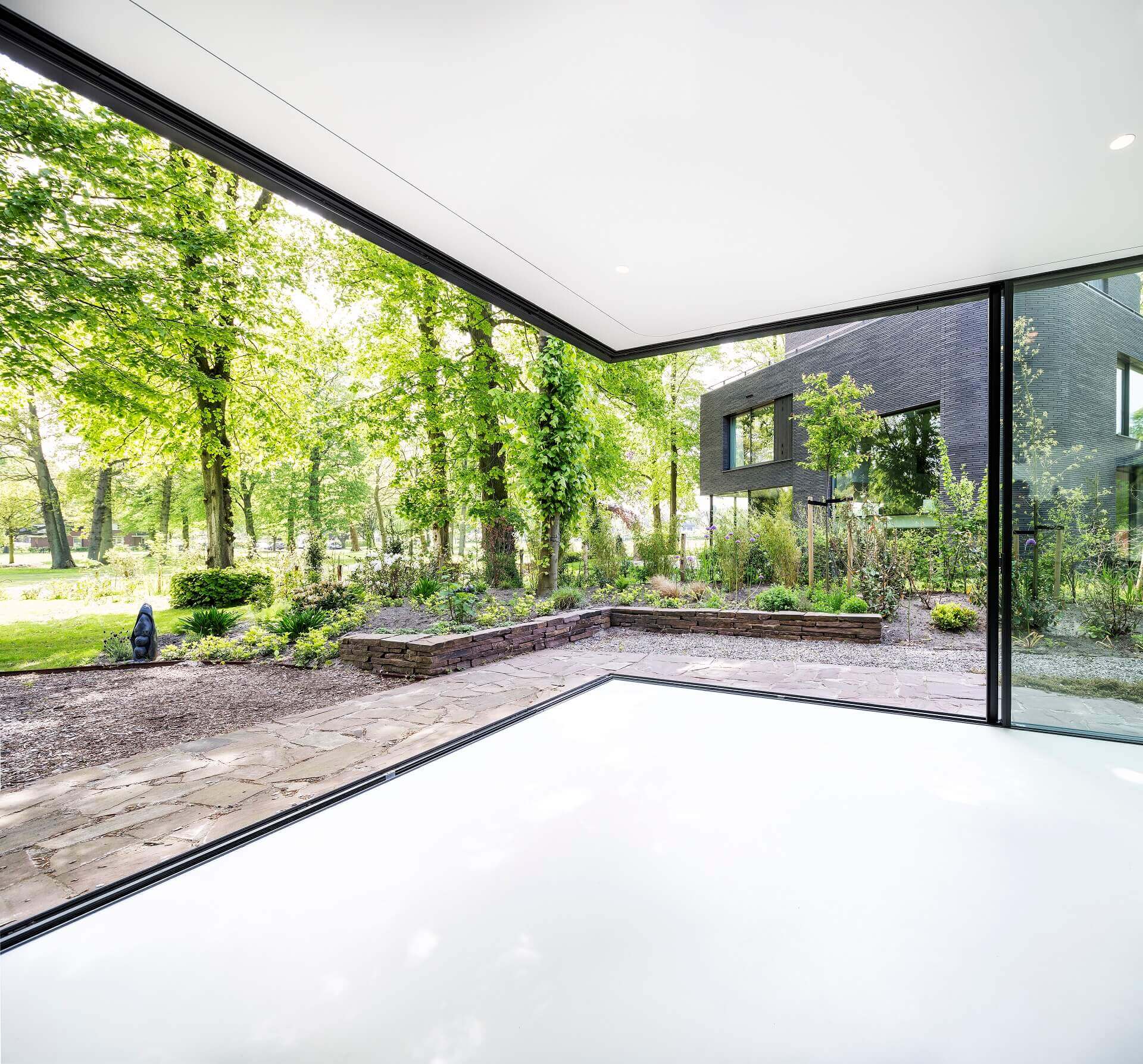 Om een zo innige mogelijke verbinding tussen interieur en exterieur te realiseren, bestaat de begane grond aan de tuinzijde bijna volledig uit glas. Voor het schuifbare deel van de pui en de gefixeerde glazen ronding koos Hofman Dujardin voor de ultraslanke profilering van Metaglas. Die biedt de transparantie die de bewoners zo verlangden. Maar met de tuinzijde is nog iets bijzonders aan de hand. De haakse hoek heeft geen enkel dragend element. Deze speciale constructie laat het plafond zweven, waardoor binnen en buiten echt één ruimte worden. De binnenruimtes van de villa zijn compact en geven een gevoel van geborgenheid. Indachtig de filosofie van de architect zijn ze op een vloeiende manier met elkaar verbonden, waarbij de keuken het hart vormt. Die keuken wordt in de namiddag uitgelicht door de warme gloed van de zon. Het huis is namelijk zo ingedeeld dat het woonprogramma de baan van de zon volgt. Die schijnt ‘s ochtends in de woonkamer, einde middag in de keuken en ’s avonds op het dakterras dat bovenop het kantoor ligt. Heel intuïtief, als je er goed over nadenkt.