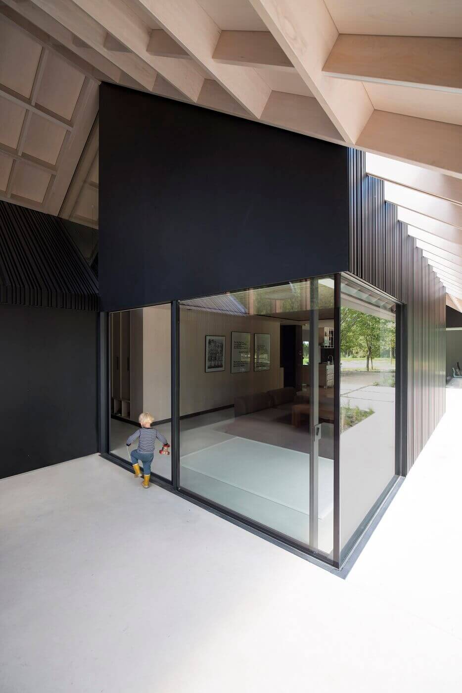 Het aluminium is slechts één van de aparte materialen die de architect voor het huis gebruikte, naast licht esdoornhout voor het interieur en fijn belijnd, antraciet metaal voor het dak. Maar de kopgevel, bekleed met een massief stalen huid, is pas echt uniek. ‘Dit materiaal, walstaal, gebruiken we wel eens voor een interieur, maar nog niet eerder voor een exterieur. Daarvoor hebben we een speciale coating laten ontwikkelen die het staal beschermt. Het materiaal heeft van nature een bijzondere tekening, van een soort vlam. Voor mij een knipoog naar de natuur.’