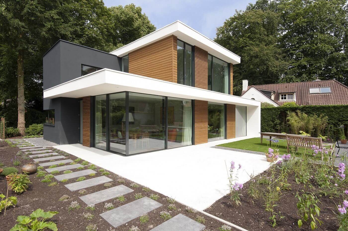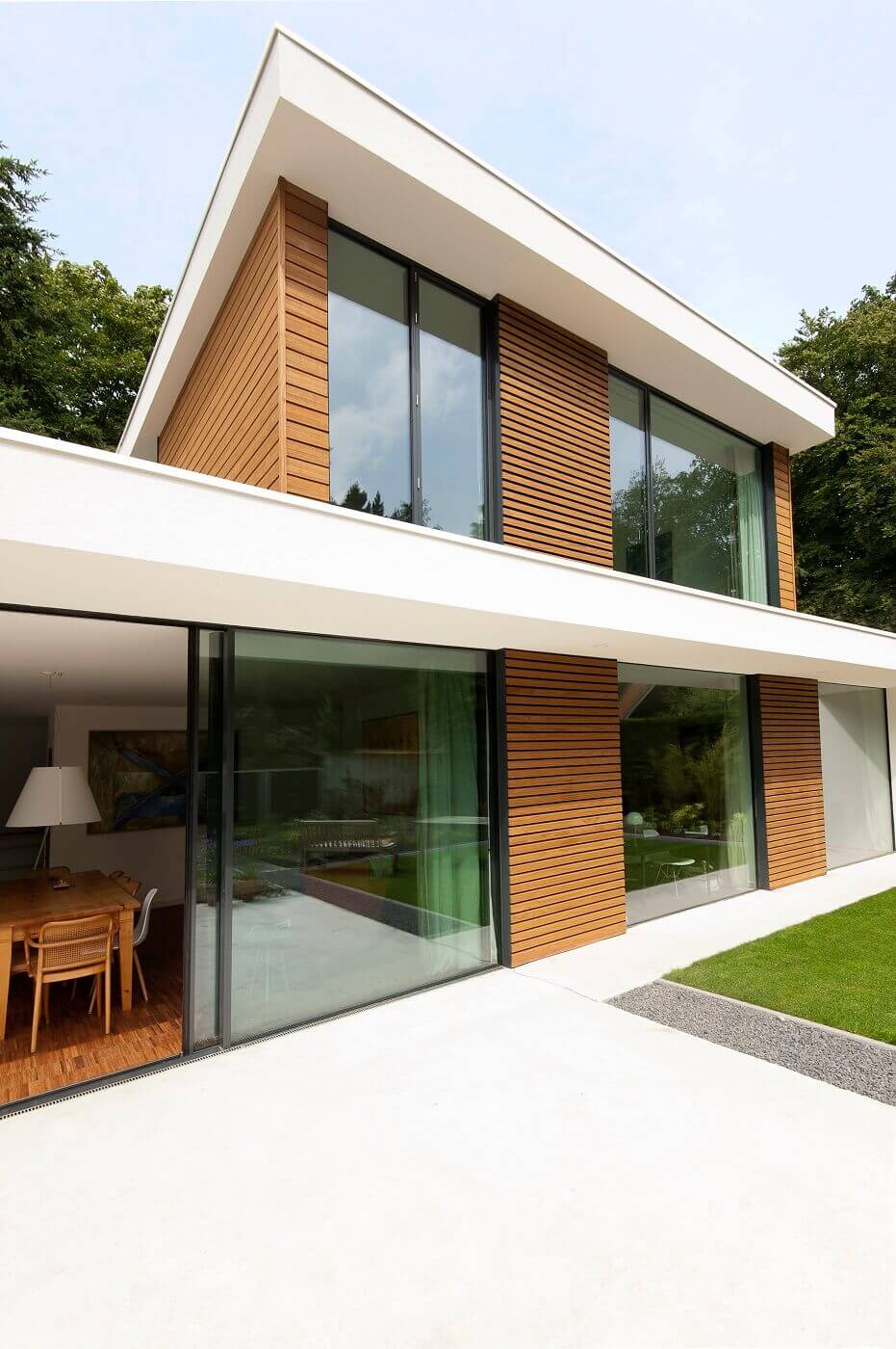 De bewoners van de villa willen optimaal profiteren van het daglicht en het uitzicht op de tuin. Daarom paste de architect aan de achterzijde van de villa een Methermo®XL open hoek schuifpui toe. Deze kan volledig worden opengezet. Door de minimale profilering is er een maximaal contact tussen binnen en buiten, vooral in de eetkamer komt het systeem goed tot zijn recht. Het schuifraam is geheel drempelloos, waardoor de vloer doorloopt in het terras; de bewoners hebben een fantastische uitzicht op de groene omgeving van de tuin.