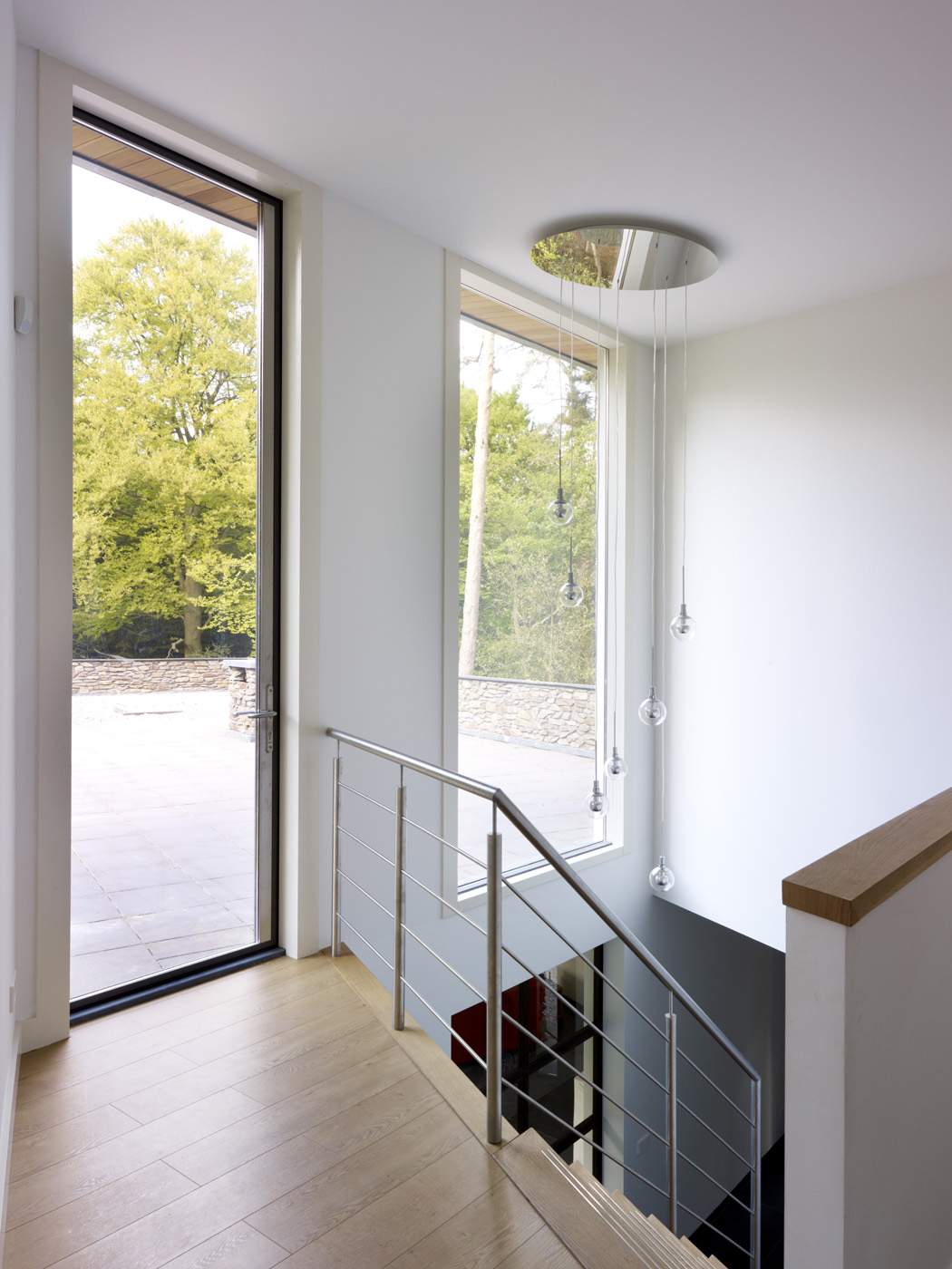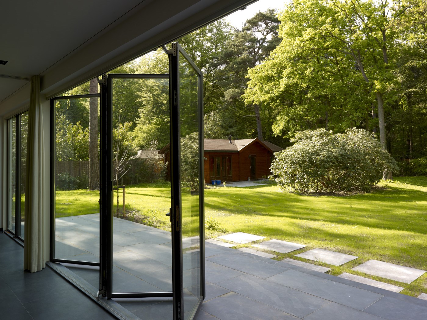 Heijmerink heeft in het paviljoen gestreefd naar een heldere, even natuurlijke ambiance. ‘Het wordt gedomineerd door een grote loungeruimte. De slanke profielen van de glazen schuifpuien gaan schuil achter de gevel, zodat alleen het glas – en daardoorheen het bos – te zien is. Het lichte stucwerk met enkele gekleurde accenten, de eikenhouten spiraaltrap en de leistenen vloer dragen heel genuanceerd bij aan de natuurlijke sfeer.’ De architect is trots op het resultaat – en vooral dat het naadloos aansluit op de woonwensen van de opdrachtgevers.